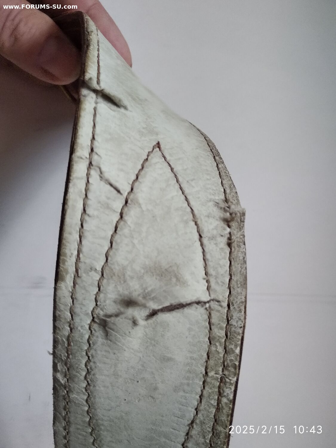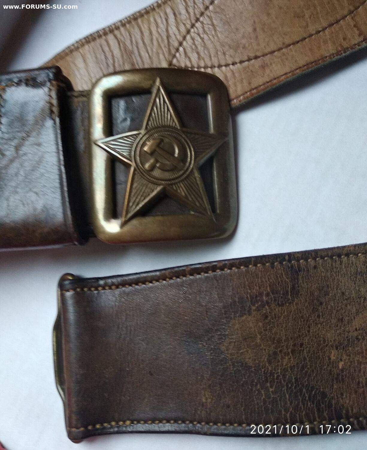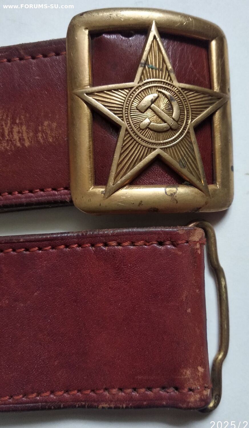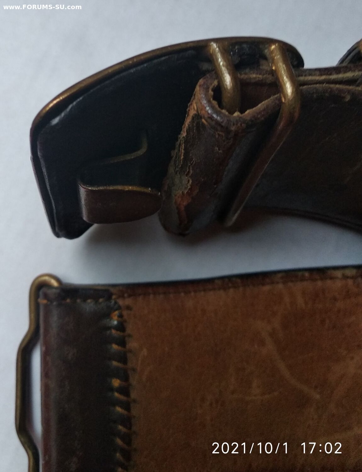 Подлинный безвопросный ремень без рукоделий и перешивов. В хорошем состоянии, мягкий, все по родне, общая длина 110см, ширина полотна 50мм (сшито из двух слоев). Клейм и других обозначений не нашел. Думается на войну, тк подложка нежно бежевого цвета и нет клейм (видел в продаже 54 года- там с клеймом и подложка почти коричневая).
