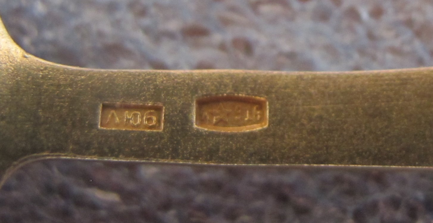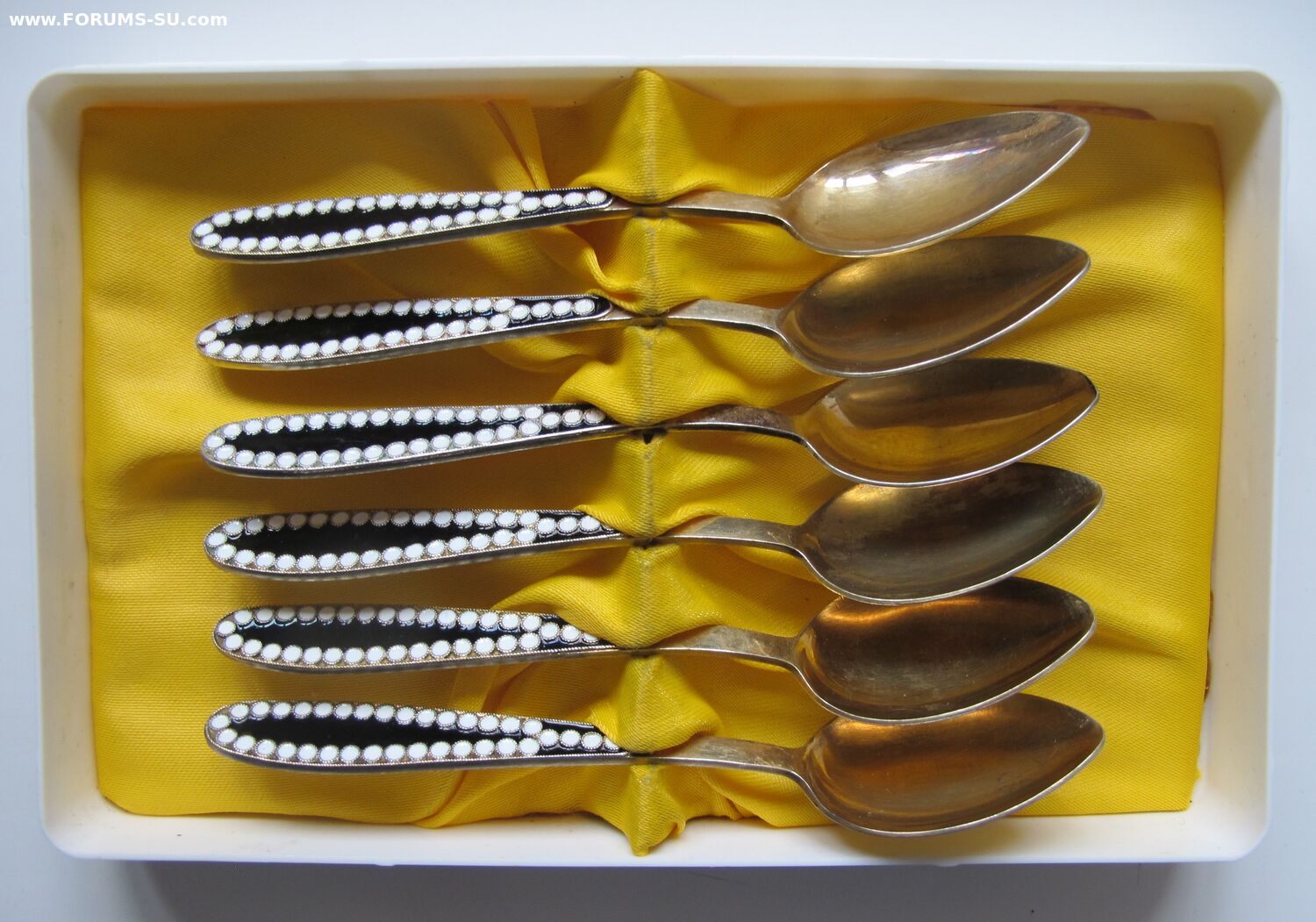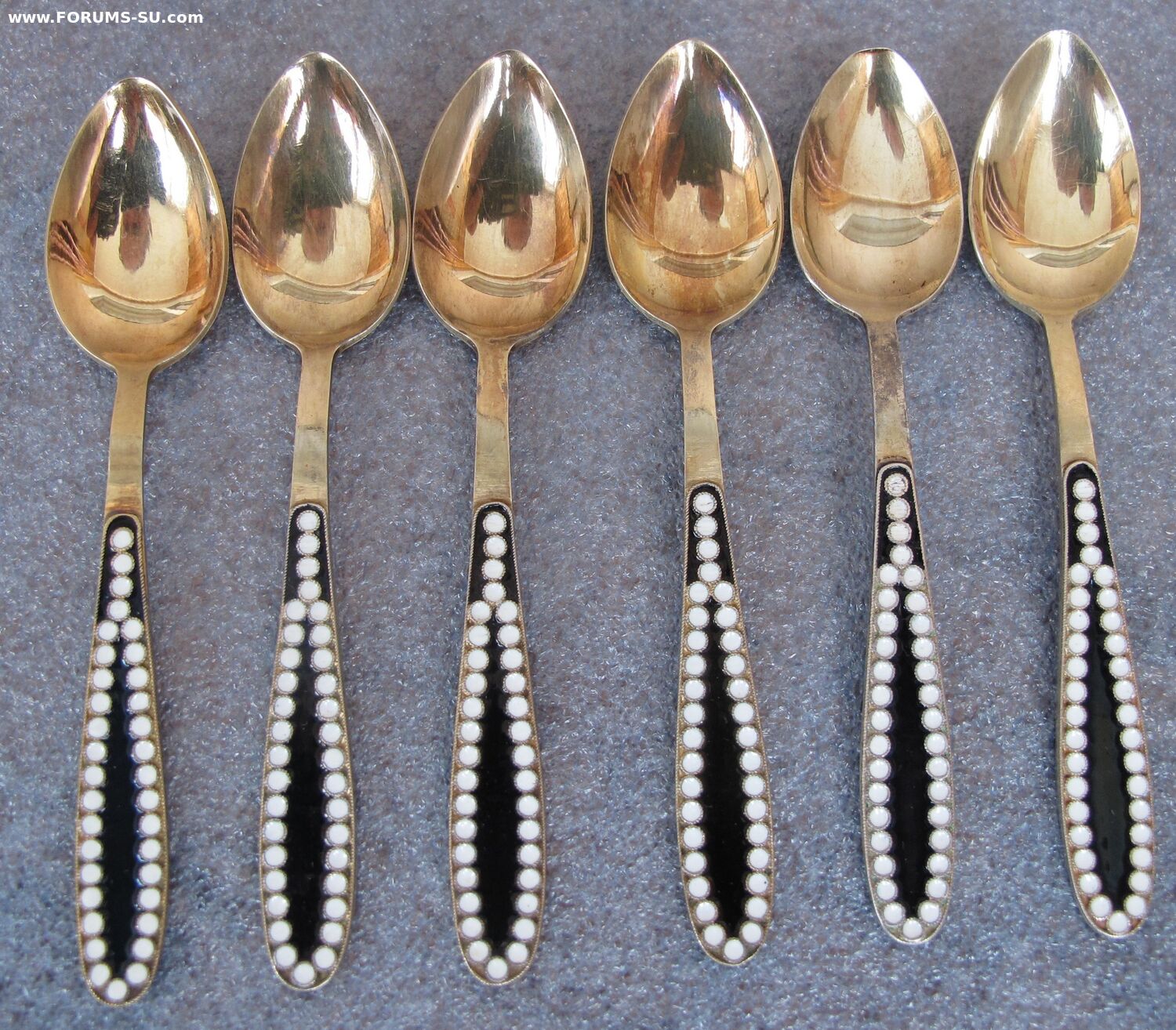В пластиковой коробочке.Состояние хорошее. Без запилов,царапок на поверхности ложек.Позолота сохранилась хорошо.На одной ложке имеются незначительное выкрашивание эмали видное при увеличении.Изготовитель - Ленинградская ювелирно-часовая фабрика,1965г. Одна ложка 1966г.Длина-11.7 см, вес- 96.8 г.