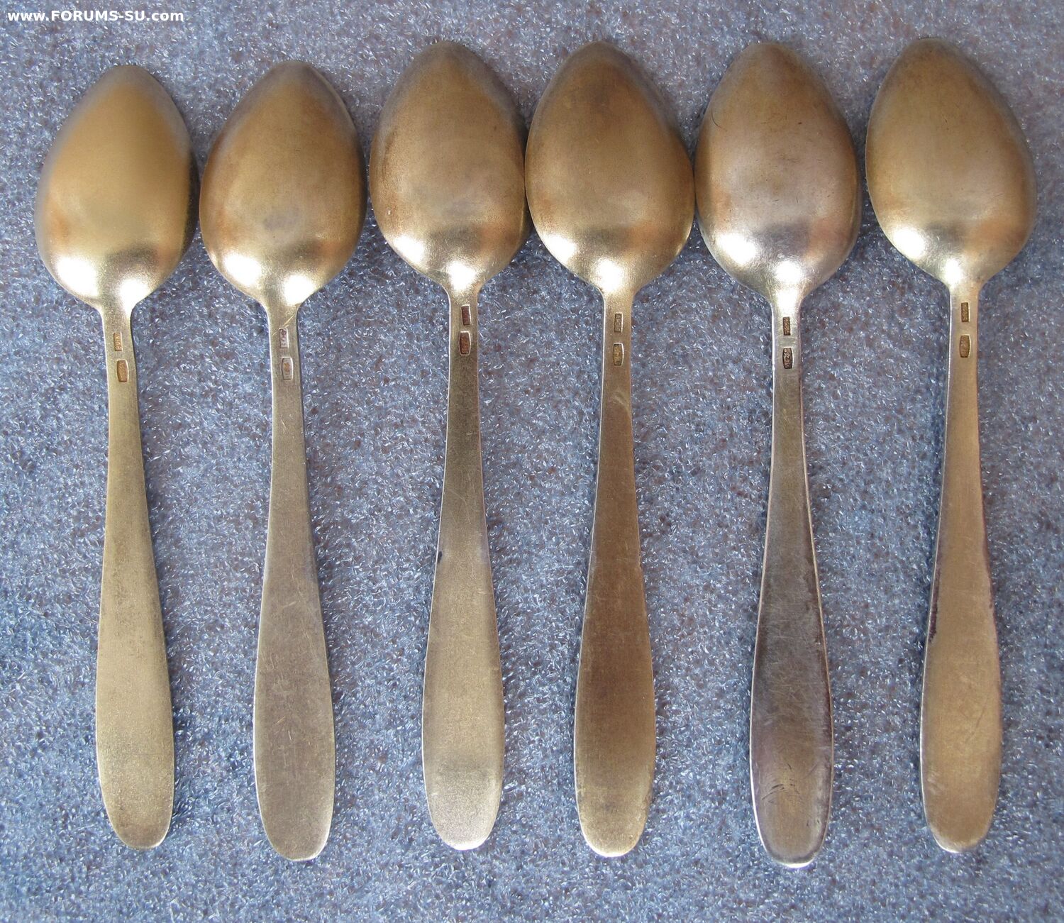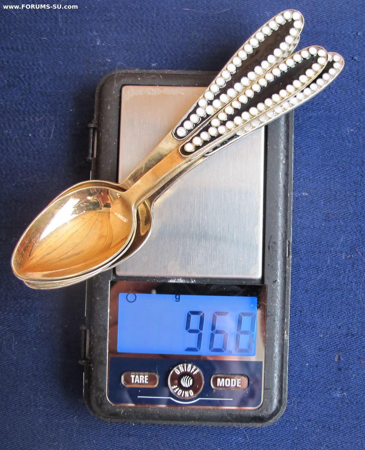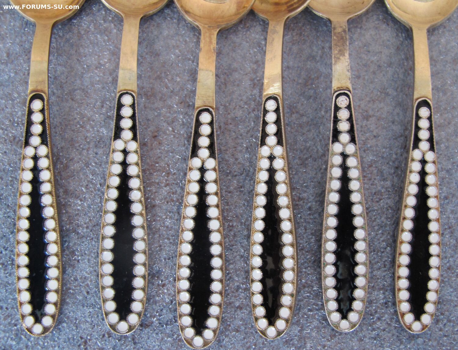 В пластиковой коробочке.Состояние хорошее. Без запилов,царапок на поверхности ложек.Позолота сохранилась хорошо.На одной ложке имеются незначительное выкрашивание эмали видное при увеличении.Изготовитель - Ленинградская ювелирно-часовая фабрика,1965г. Одна ложка 1966г.Длина-11.7 см, вес- 96.8 г.