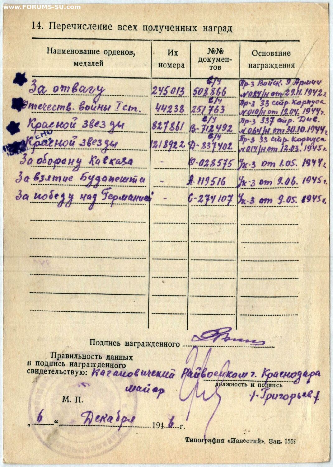 Красного Знамени, Суворова, Кутузова, Богдана Хмельницкого, Александра Невского, Ушакова, Нахимова, Отечественной Войны, Красной Звезды, Славы, За Службу Родине в ВС СССР