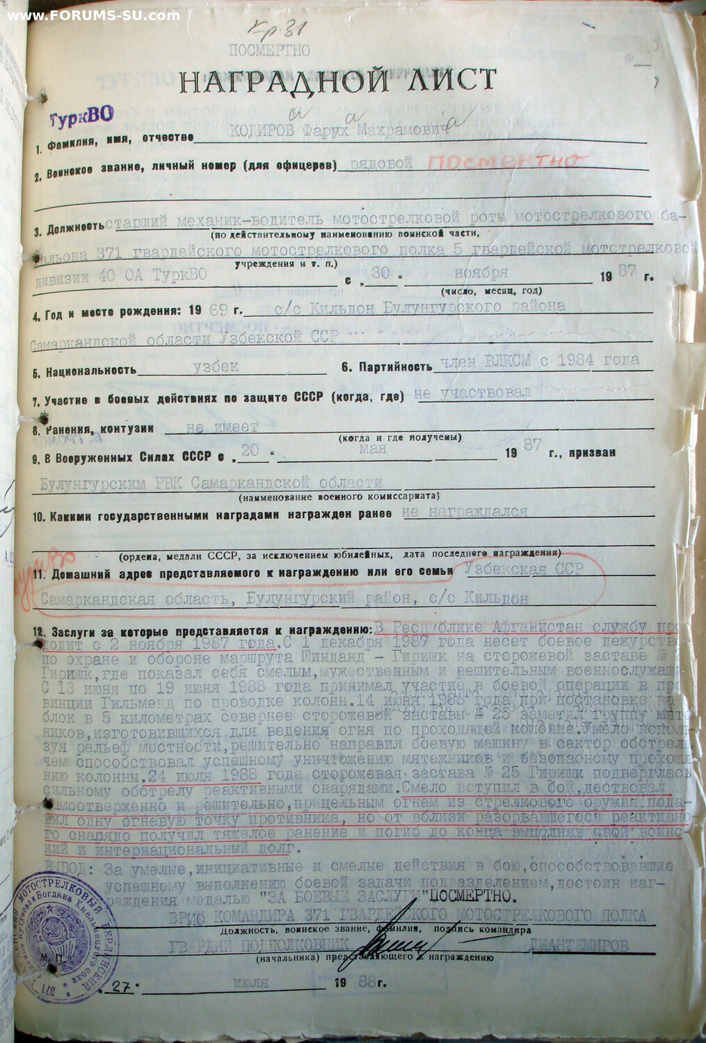 Красного Знамени, Суворова, Кутузова, Богдана Хмельницкого, Александра Невского, Ушакова, Нахимова, Отечественной Войны, Красной Звезды, Славы, За Службу Родине в ВС СССР