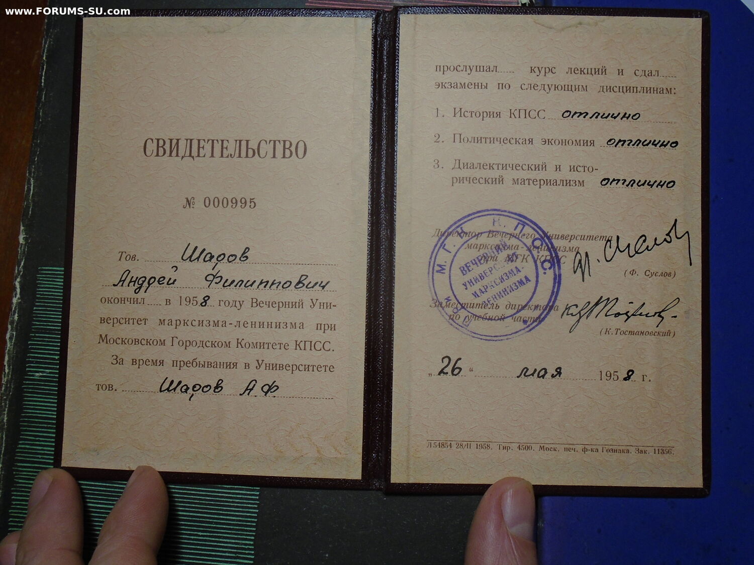 Свидетельство № 000995. Вечерний Университет марксизма-ленинизма при МГК КПСС 1958. Все три предмета (1. История КПСС; 2. Политическая экономия; 3. Диалектический и исторический материализм) - отлично!