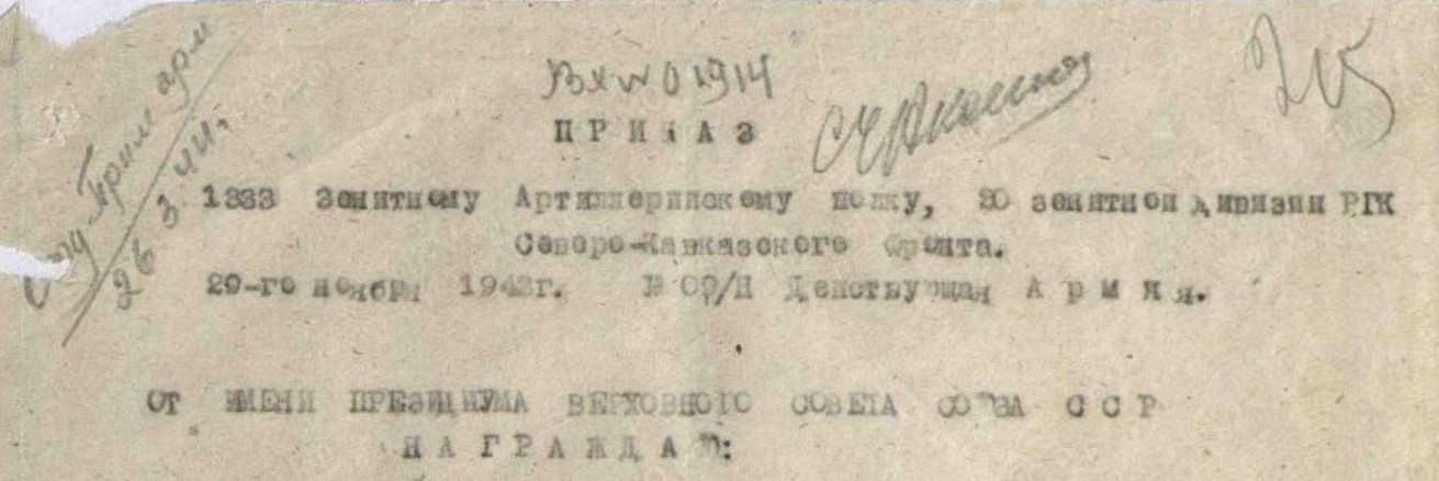 1.02.1943 отправлен в район с.Джубга для усиления ПВО.