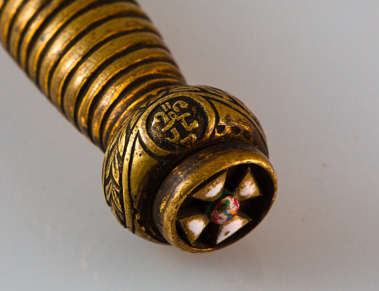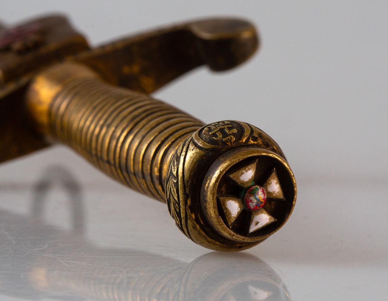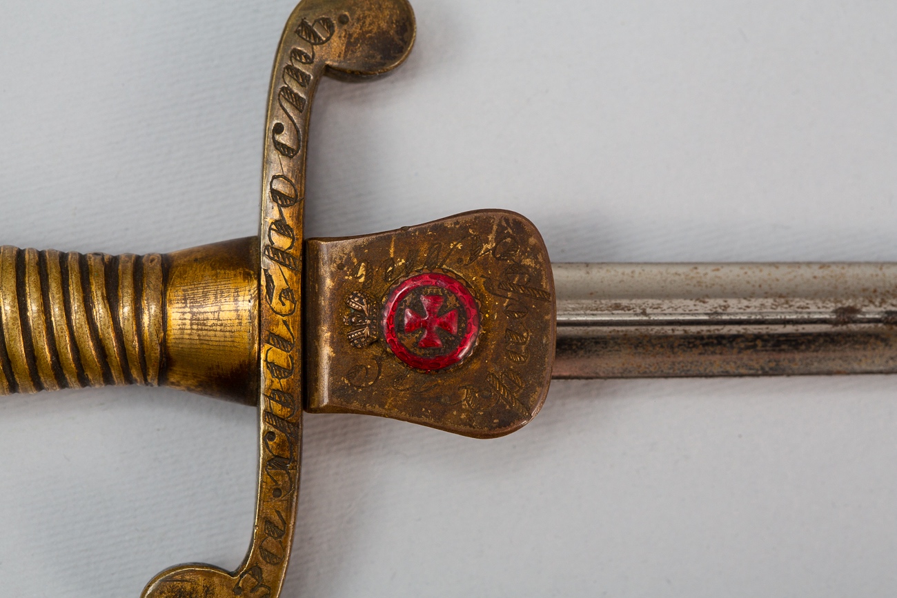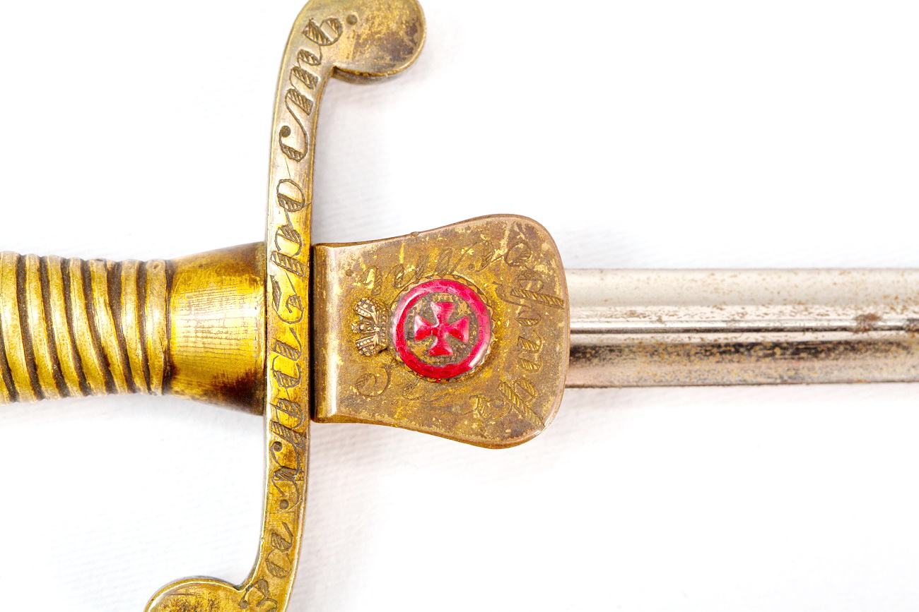 Надпись на гарде и на щитке делал один гравер. Это значит, что щиток делался под этот кортик. Но, в таком случае, как могла возникнуть такая несуразная дырка? Рыжая ржавчина на столетнюю не похожа и с потертостью позолоты явно перестарались, особенно в "мертвых зонах". Твой друг Г. отлично наловчился позолоту делать, но это же не сабля времен Крымской войны, а кортик Первой мировой. Кто его так заносил, что не только вся позолота, но даже металл стерся? Состояние "клюквы" никак не соответствует щитку, на котором позолота стерлась, а на эмали ни царапинки. Вековая грязь на крестике "Георгия", как и "родная" рваная портупея - лишнее, не нужно так перебарщивать с "достоверностью".