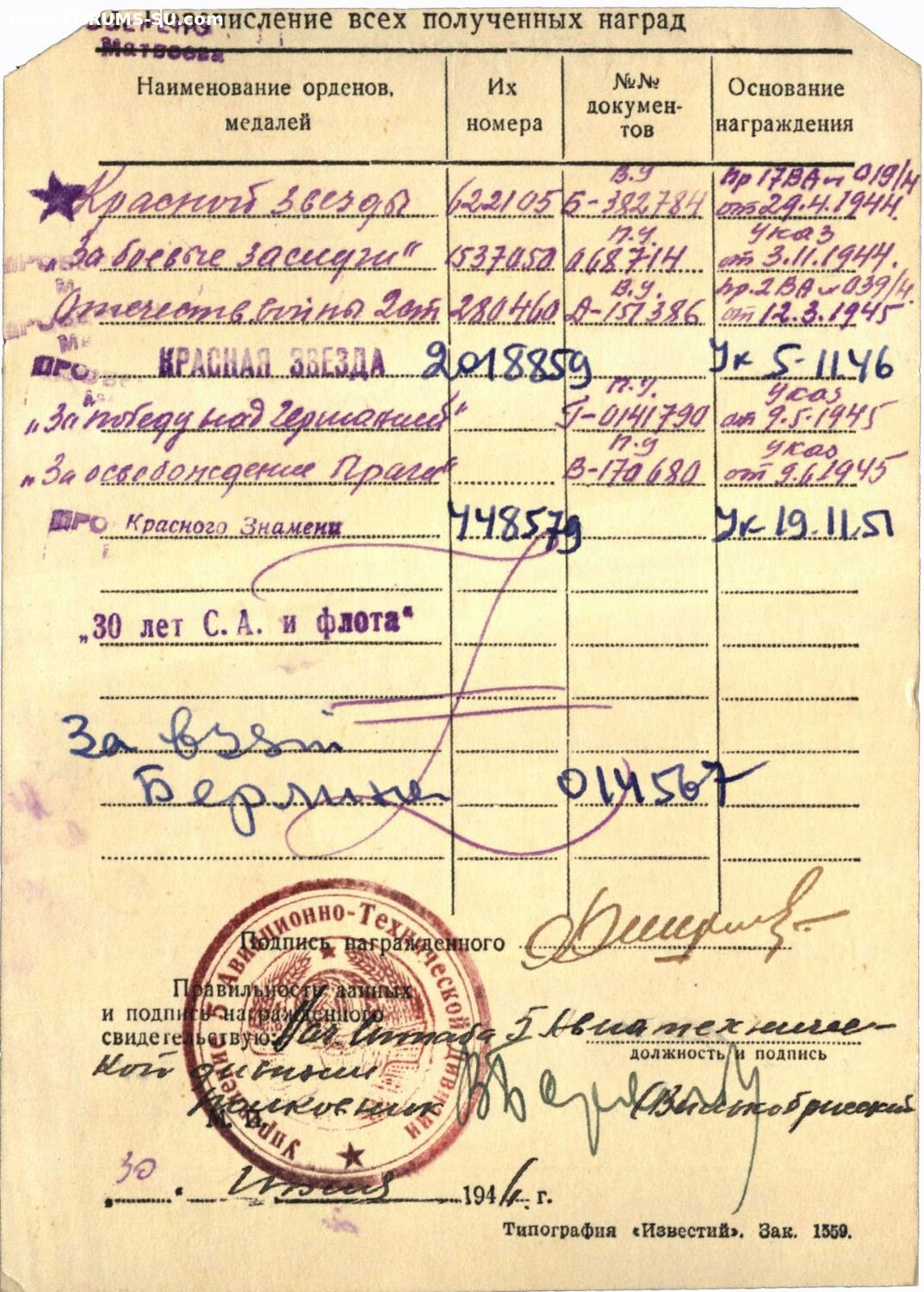 Красного Знамени, Суворова, Кутузова, Богдана Хмельницкого, Александра Невского, Ушакова, Нахимова, Отечественной Войны, Красной Звезды, Славы, За Службу Родине в ВС СССР