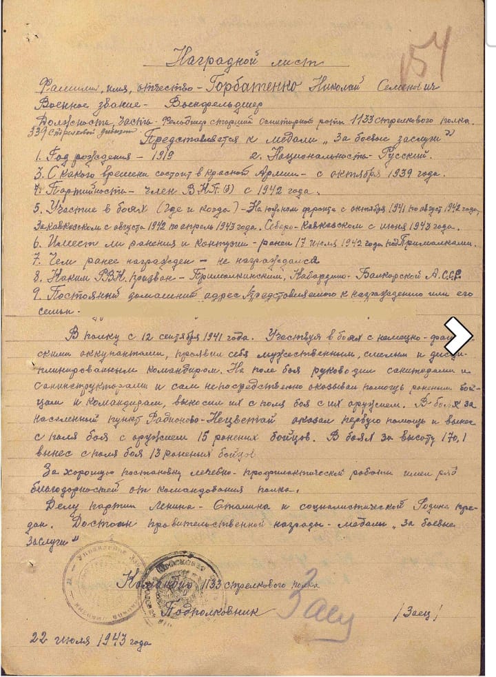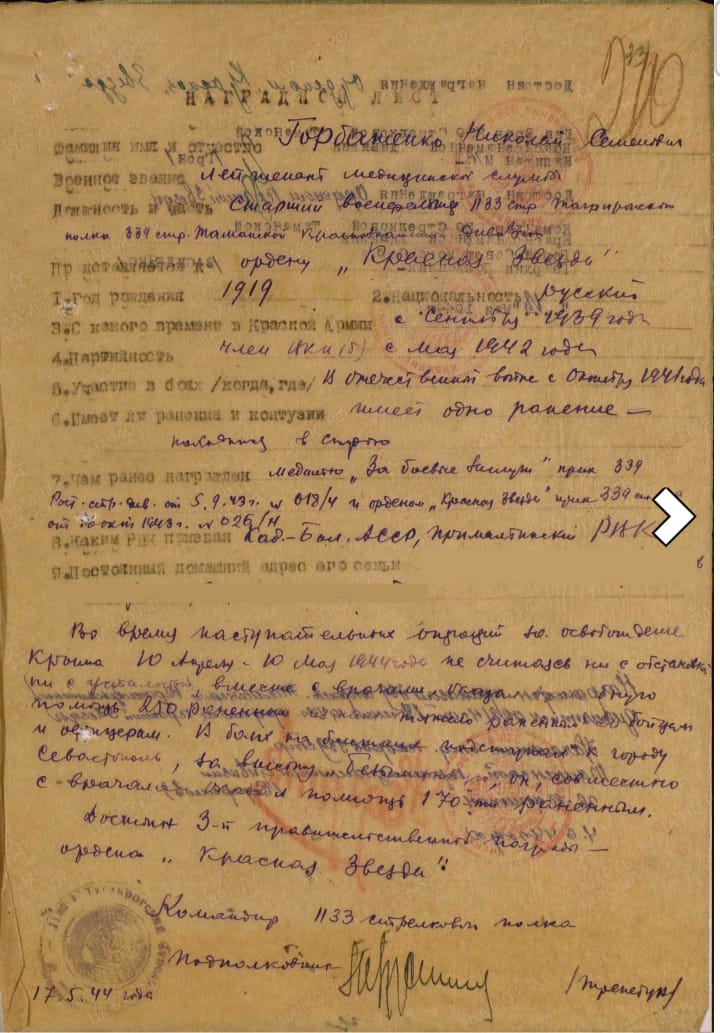 Освобождение Крыма и г Севастополь. Военфельдшер совместно оказал мед.помощь более 420 раненым бойцам и офицерам. Почта 1кл 400. Мпц 8000.