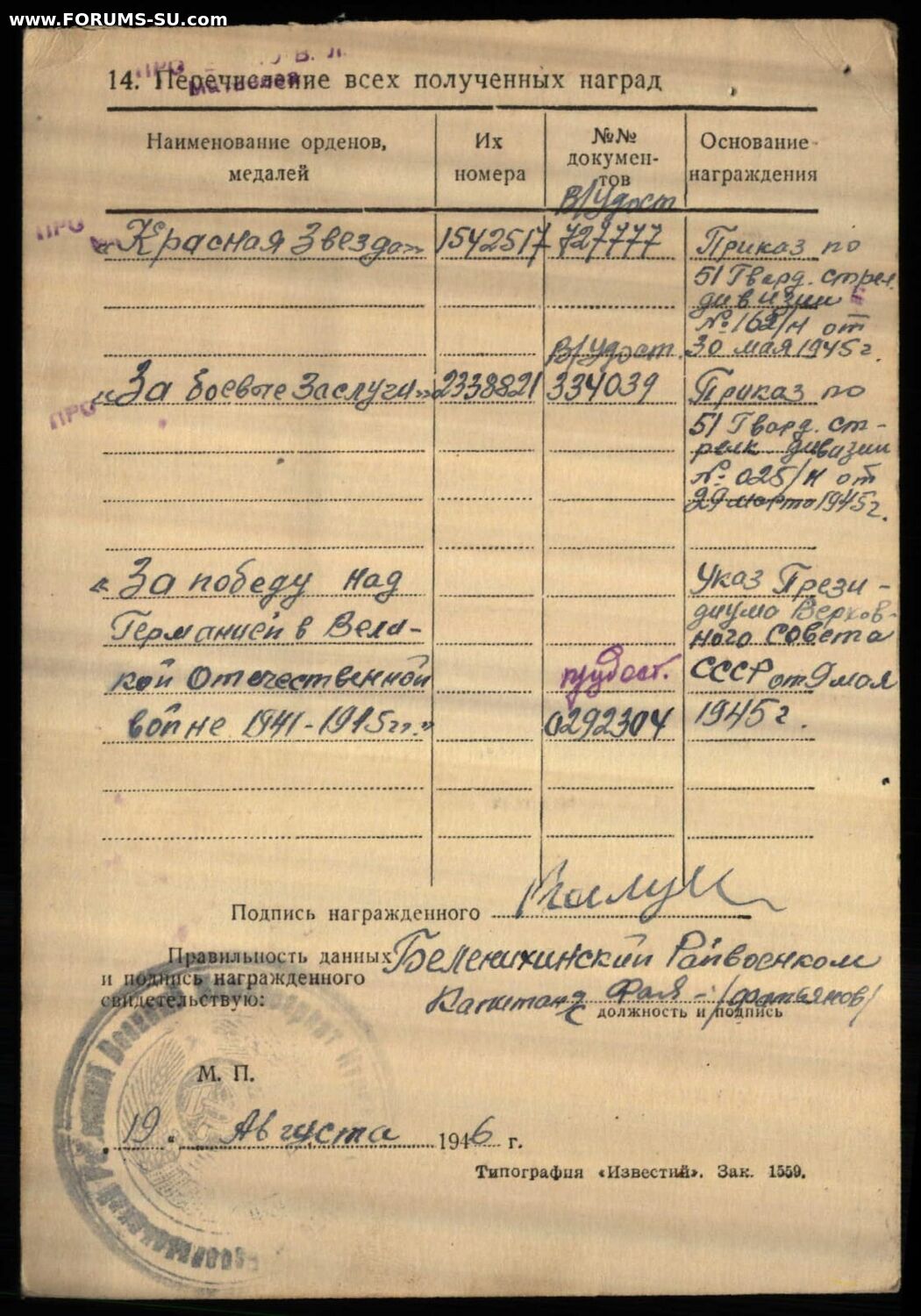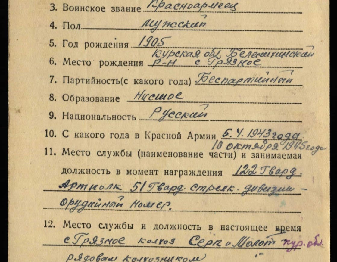 Красного Знамени, Суворова, Кутузова, Богдана Хмельницкого, Александра Невского, Ушакова, Нахимова, Отечественной Войны, Красной Звезды, Славы, За Службу Родине в ВС СССР