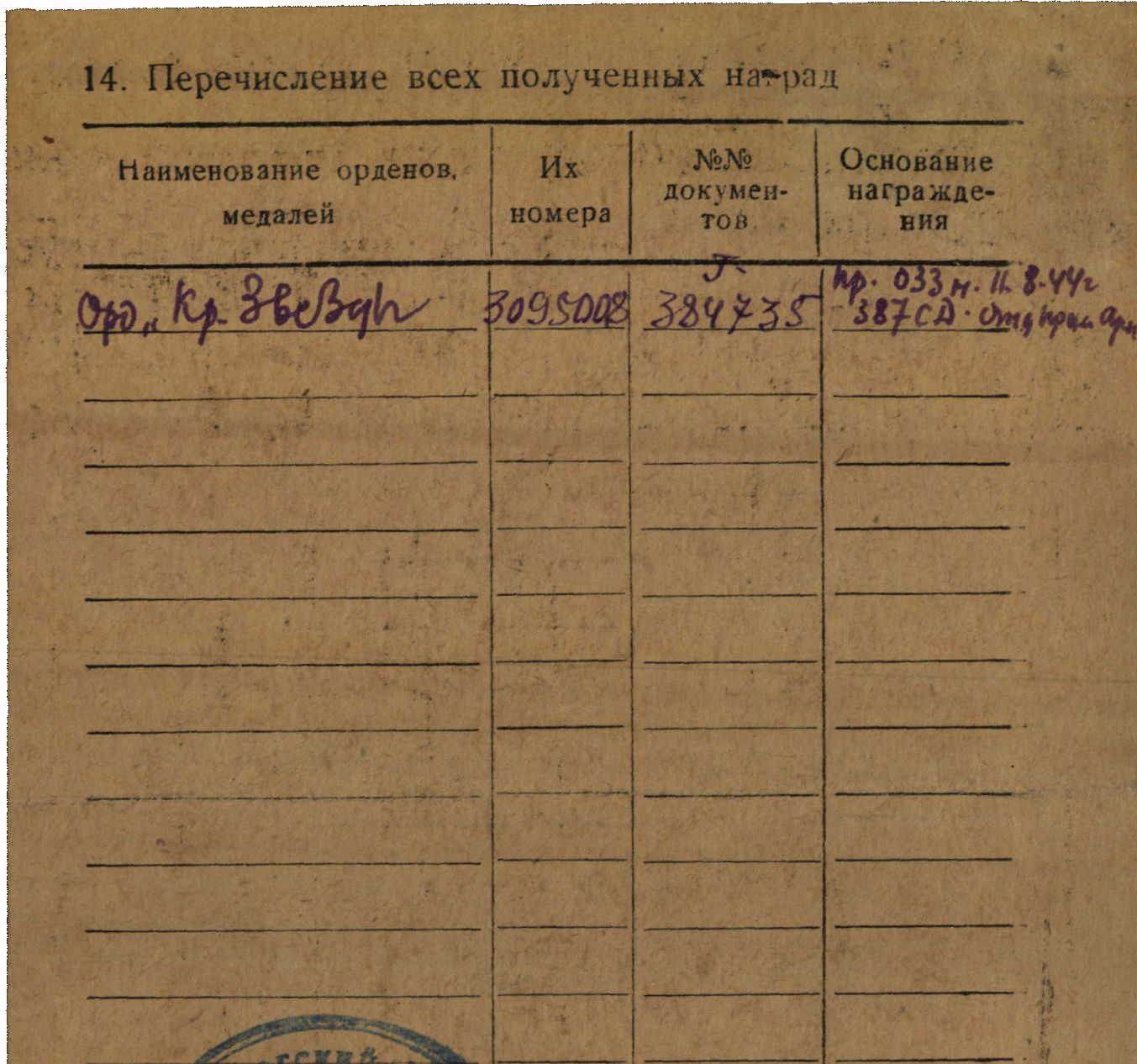 Кавалер 1903 г.р. Вторую КЗ получил уже в 94 года в 1996 году. Проживал на оккупированных территориях и призван в армию в сентябре 1943 года. Был в штрафной роте. Осуждён к высшей мере наказания - расстрелу. Но остался живой. Подробностей уже не узнать. Отличный боевой наградной лист.