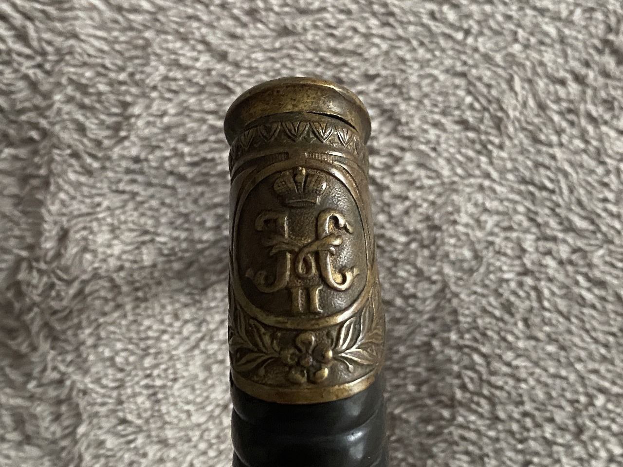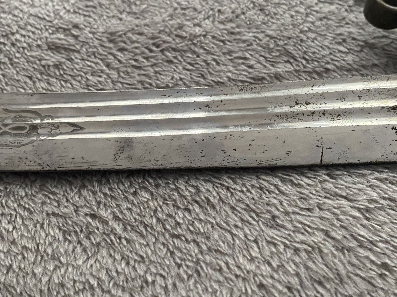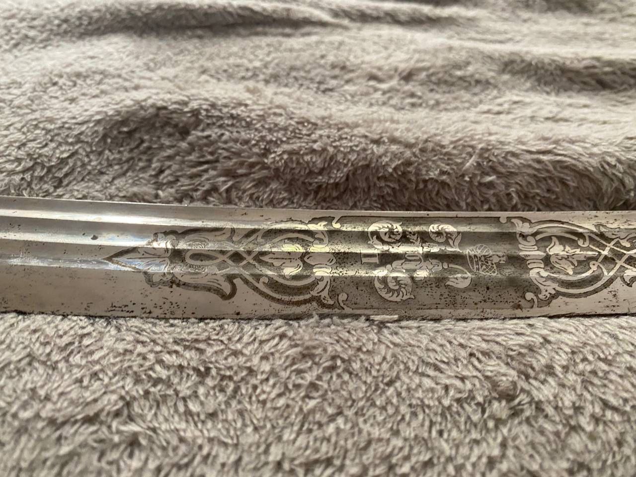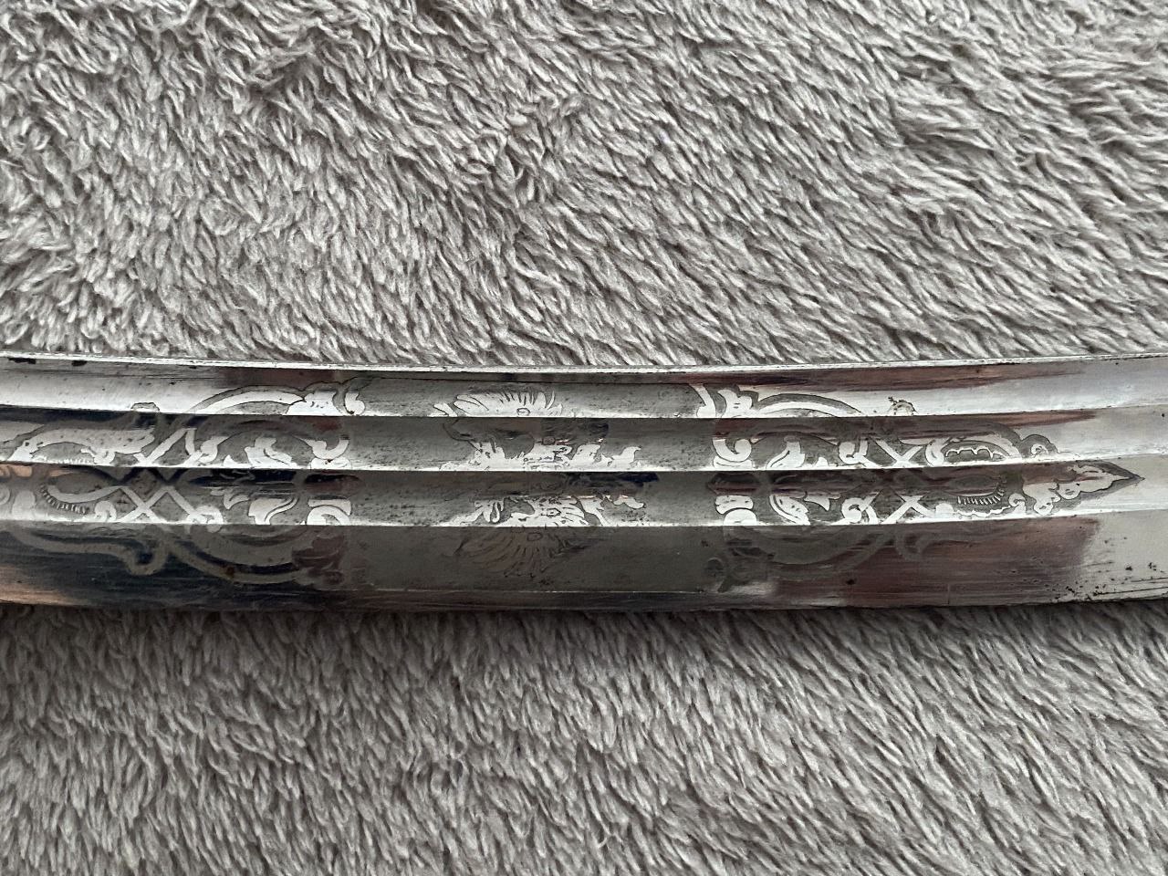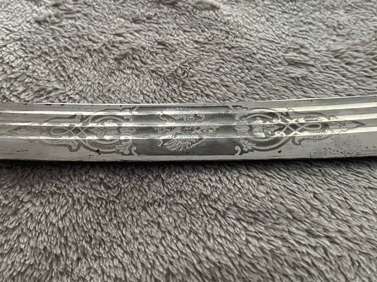 На клинке травлением нанесены изображения: слева - государственного герба Российской Империи, справа - вензеля императора Николая II, оба в обрамлении растительного орнамента.