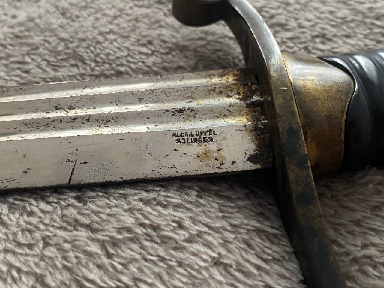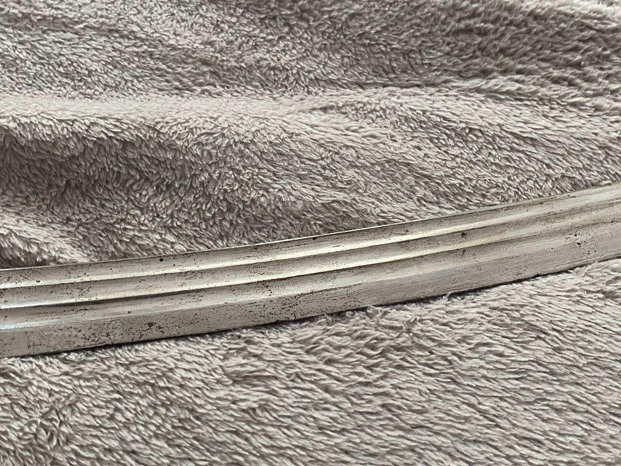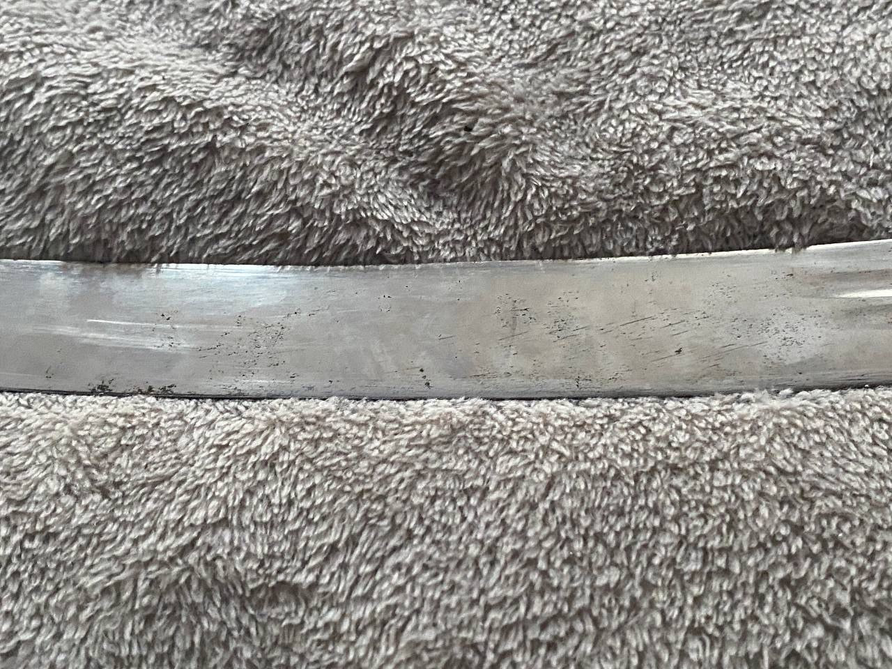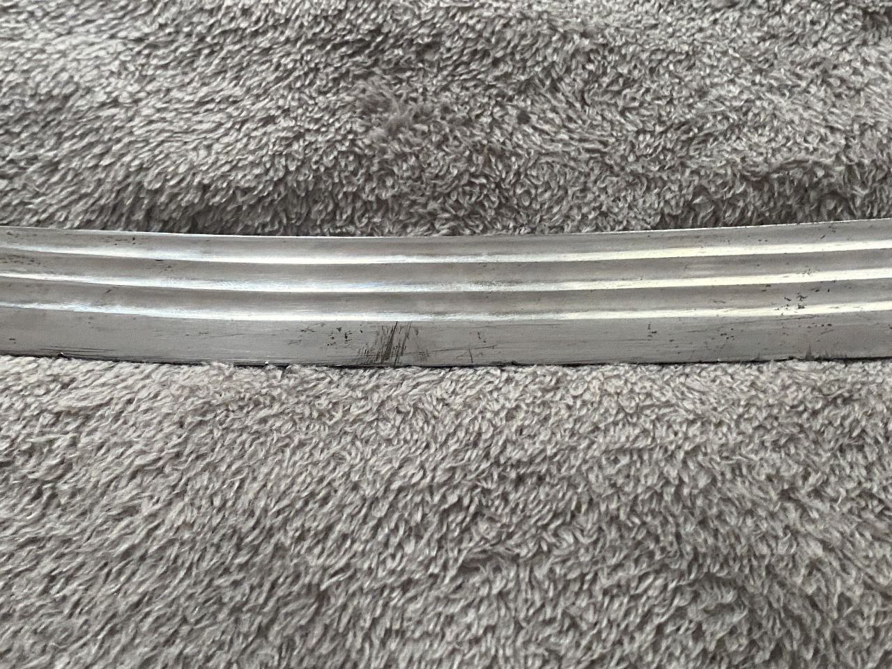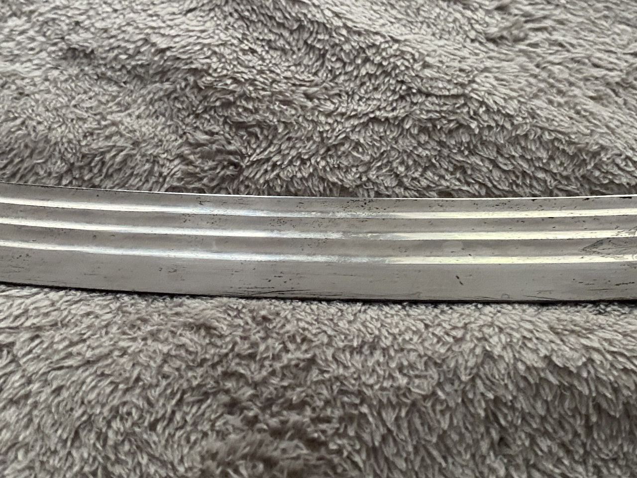 На клинке травлением нанесены изображения: слева - государственного герба Российской Империи, справа - вензеля императора Николая II, оба в обрамлении растительного орнамента.