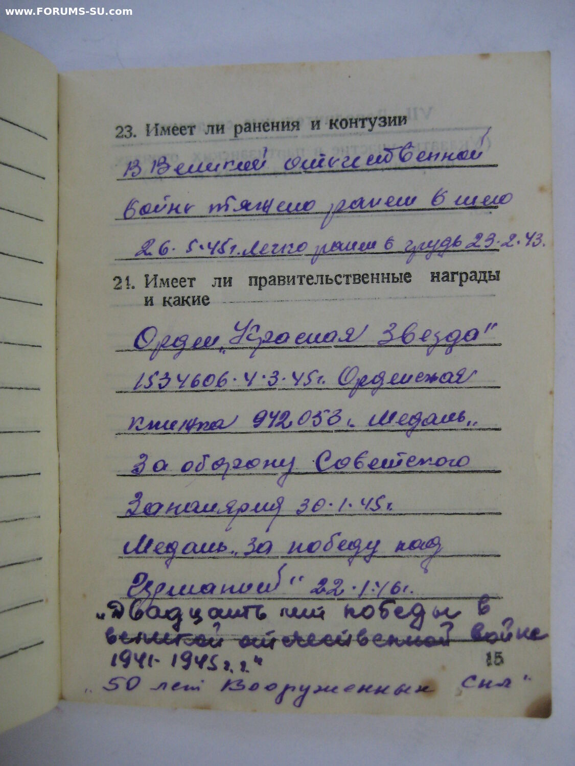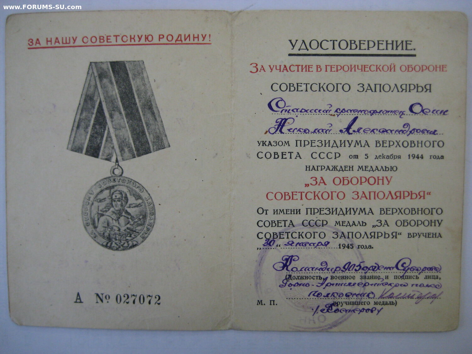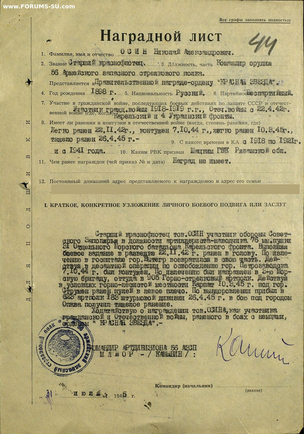 1941 - 1945 – ст. краснофлотец, артиллерист-наводчик батареи 76 мм пушек 31-го Отдельного морского батальона Карельского фронта