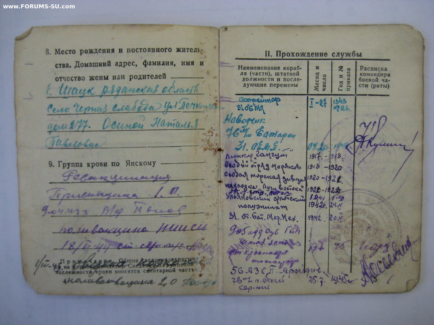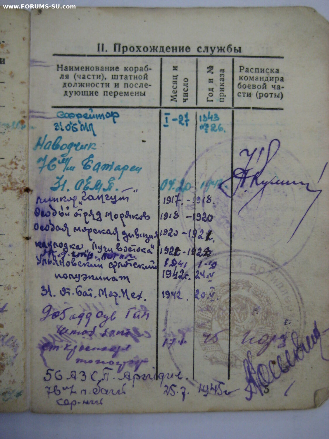 1918 - 1920 – матрос, Особый отряд моряков;1920 - матрос, Особая морская дивизия; 1921-1922 матрос, канлодка «Лучи Востока»;