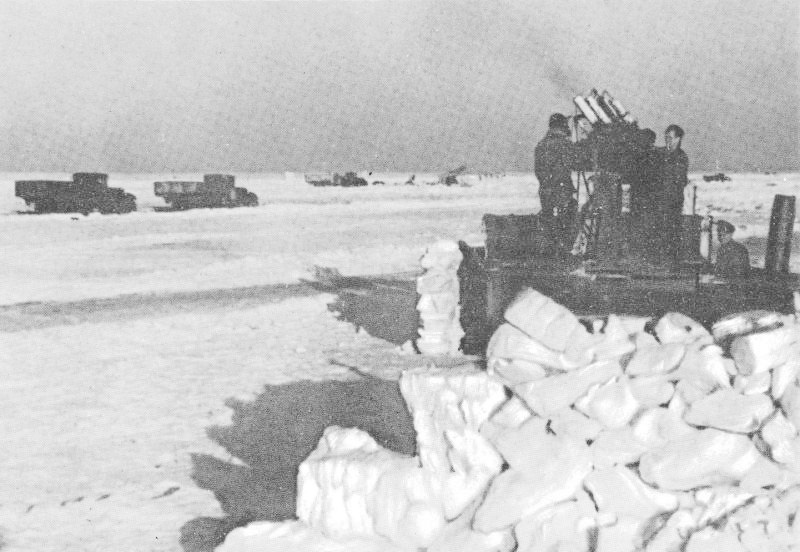 Применение пулеметных установок и прожекторов на льду себя полностью оправдало. Наличие средств ПВО на льду заставило самолеты противника увеличить высоту полета, тем самым снизило эффективность боевых действий авиации противника. Средства ПВО, обороняющие ледовые дороги, должны быть постоянно готовыми к переезду, поэтому целесообразно всем средствам быть поставленными на сани. Для безотказной работы связи необходимо с подразделениями иметь, помимо проволочной связи, радиосвязь и связь зрительными сигналами (ракеты, лучи). Материальная часть и личный состав на льду работают так же, как и на земле."