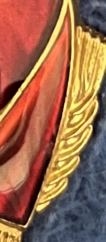 Есть крохотный чешуйчатый скол на нижней части флага справа посередине золотого колоса.