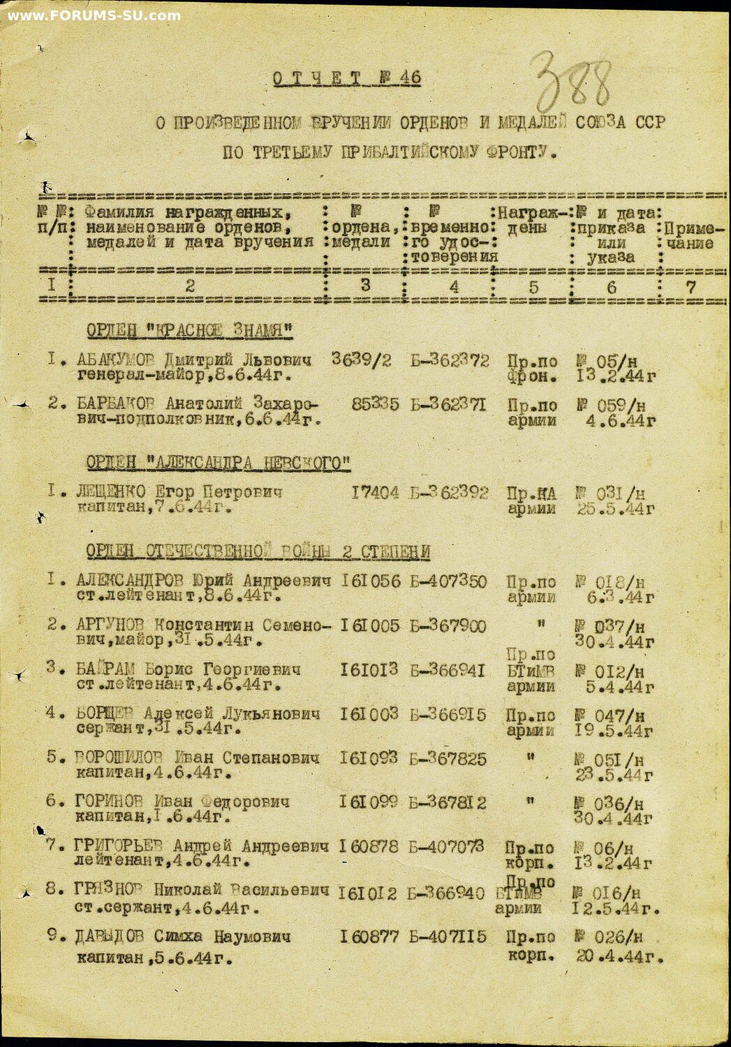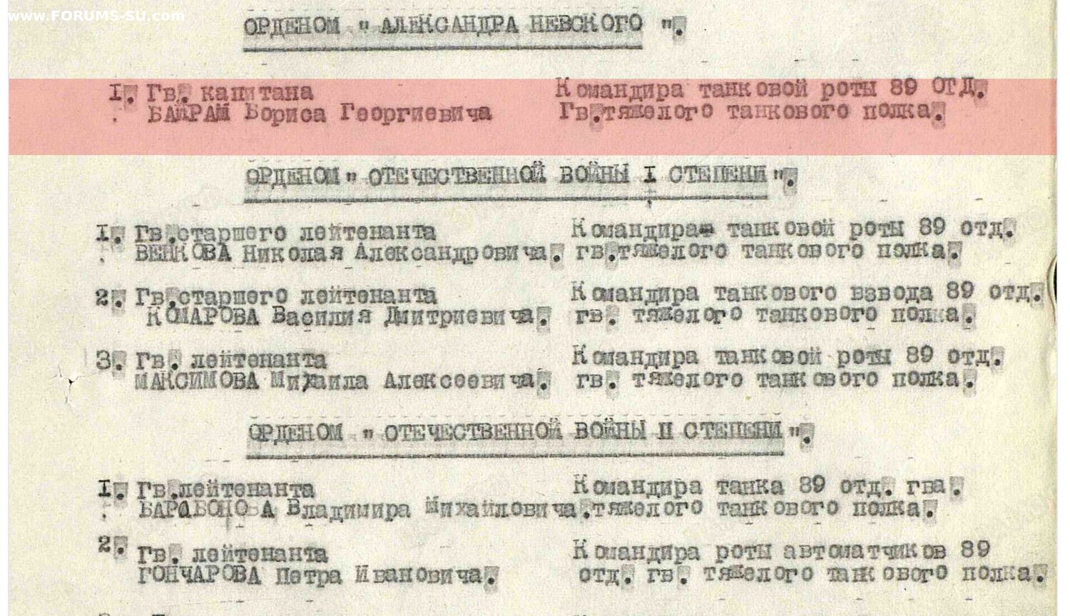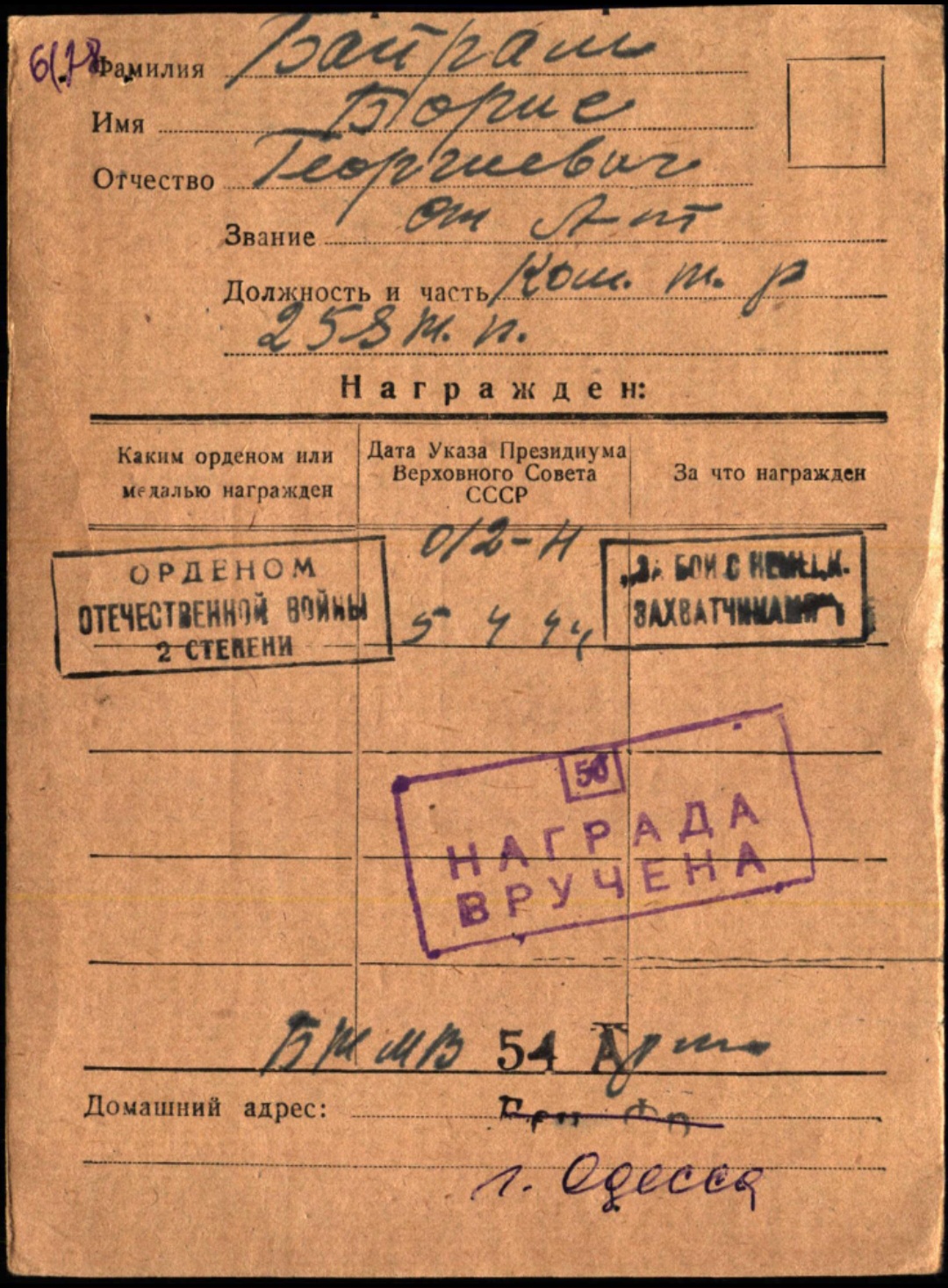 Красного Знамени, Суворова, Кутузова, Богдана Хмельницкого, Александра Невского, Ушакова, Нахимова, Отечественной Войны, Красной Звезды, Славы, За Службу Родине в ВС СССР
