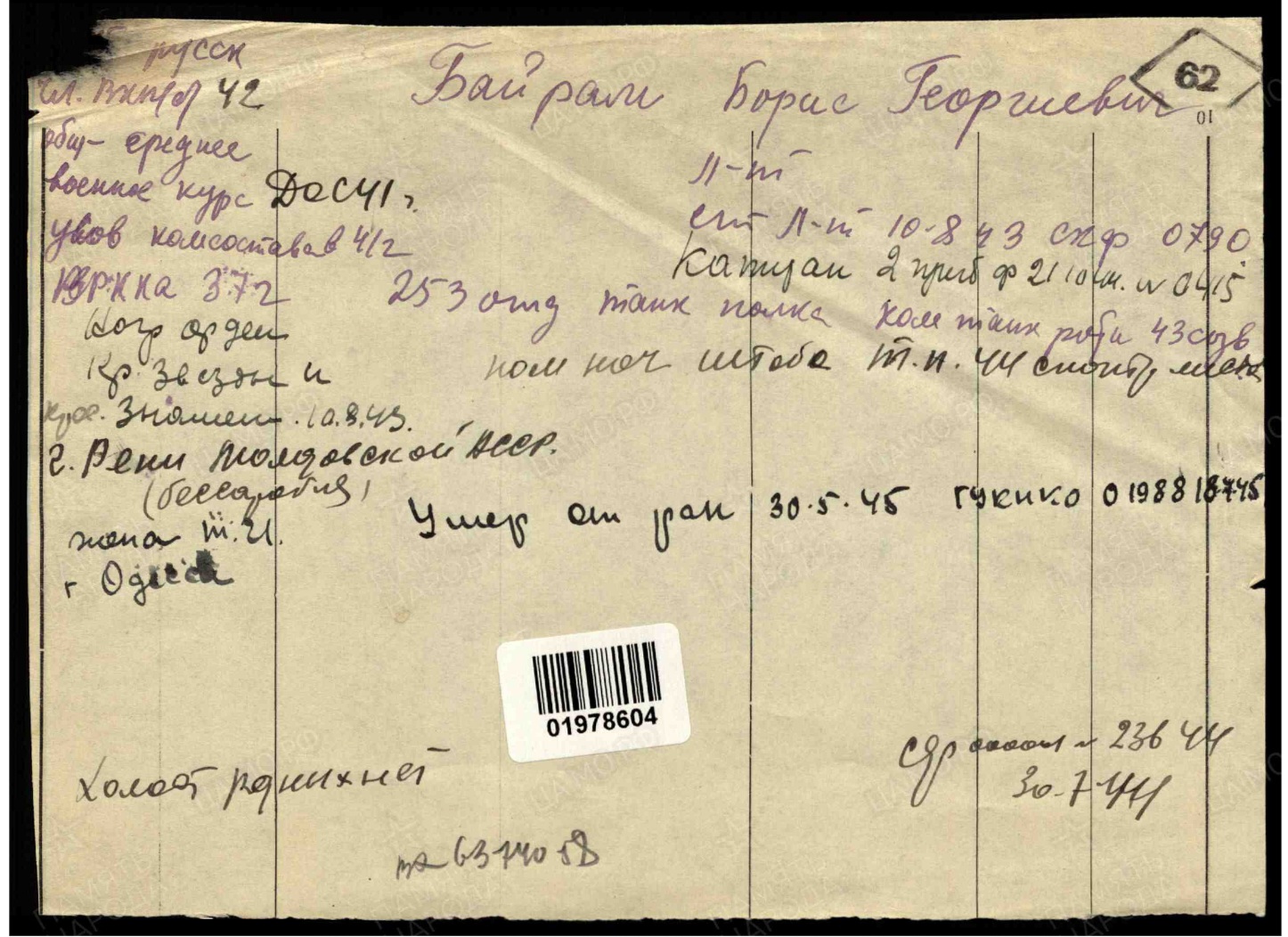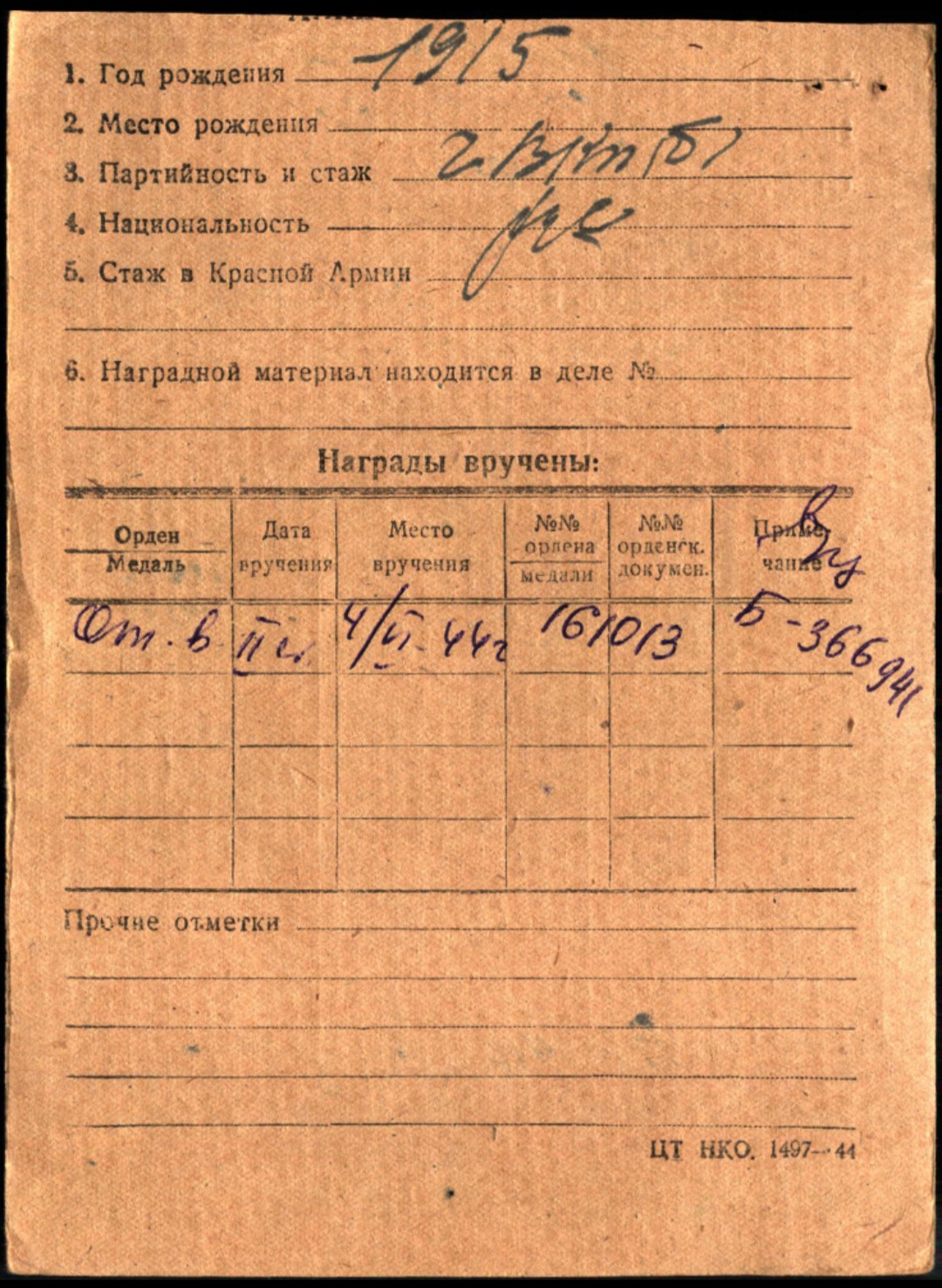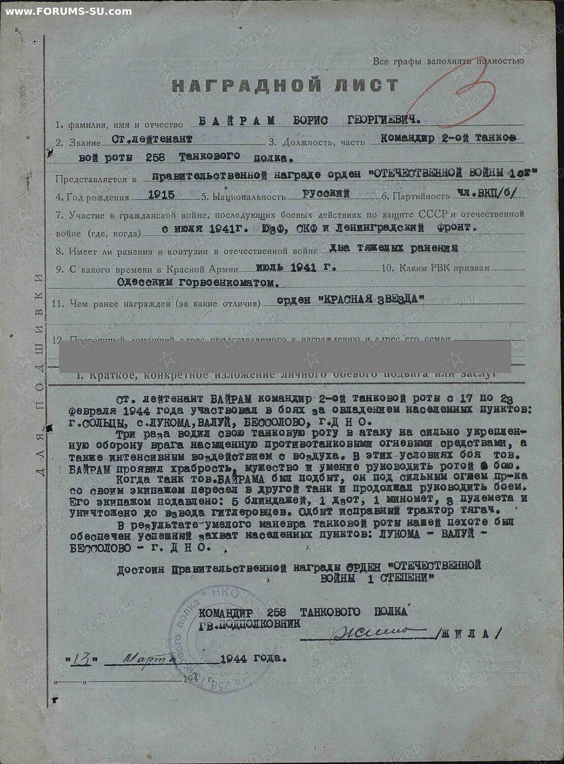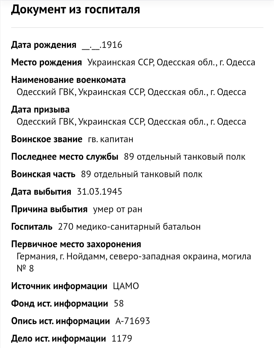 Кавалер танкист, командир танковой роты. За время ВОВ был ЧЕТЫРЕЖДЫ! ранен, два тяжелых ранения, одно легкое, четвертое пережить не смог, - умер от ран 30 мая 1945г, похоронен в Германии.
