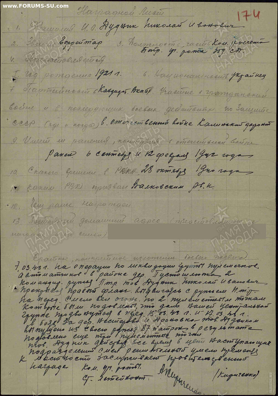 НЛ на бронебойщика (наводчик ПТР), боевой подвиг по подавлению немецких пулеметных точек