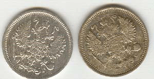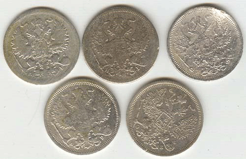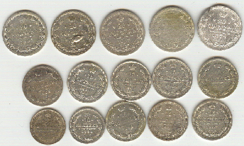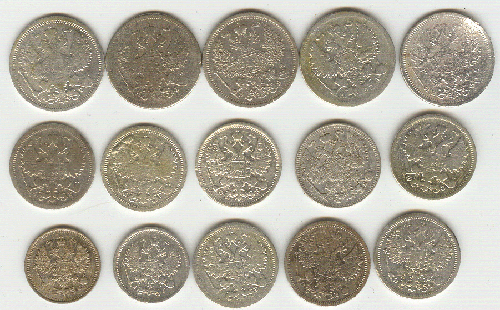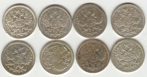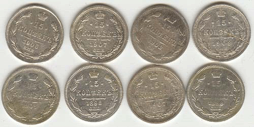 15 копеек - 1898,1907,1907,1909,1902,1898,1908,1901 г.