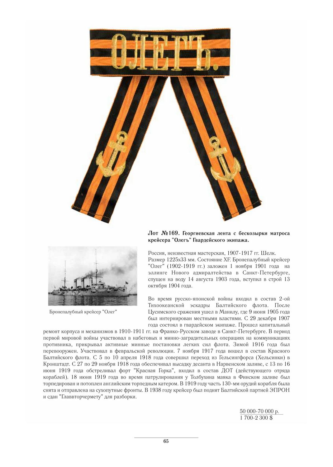 Георгиевская ленточка на бескозырку матроса бронепалубного крейсера 1-го ранга "Олег" Гвардейского экипажа. Неизвестная мастерская, 1907-1917 гг. Длина 167 см. Ширина 3,2 см. Очень хорошая сохранность. Несколько потёрт один конец ленты с якорем. Очень редкая. Если кому-то интересно - предложения в личку.
