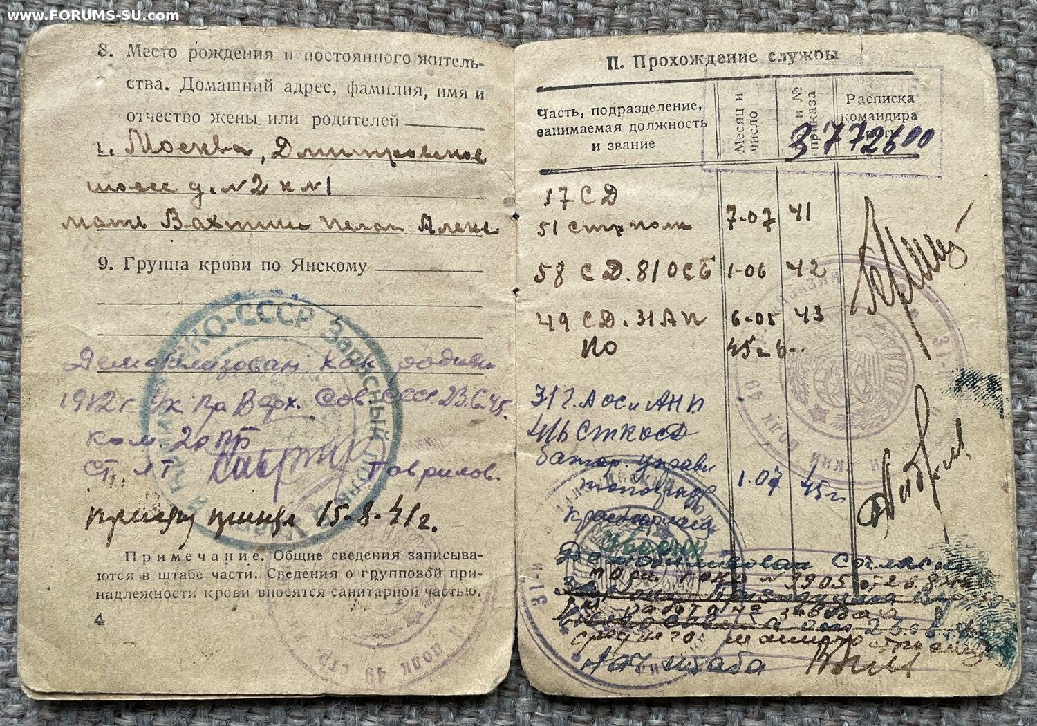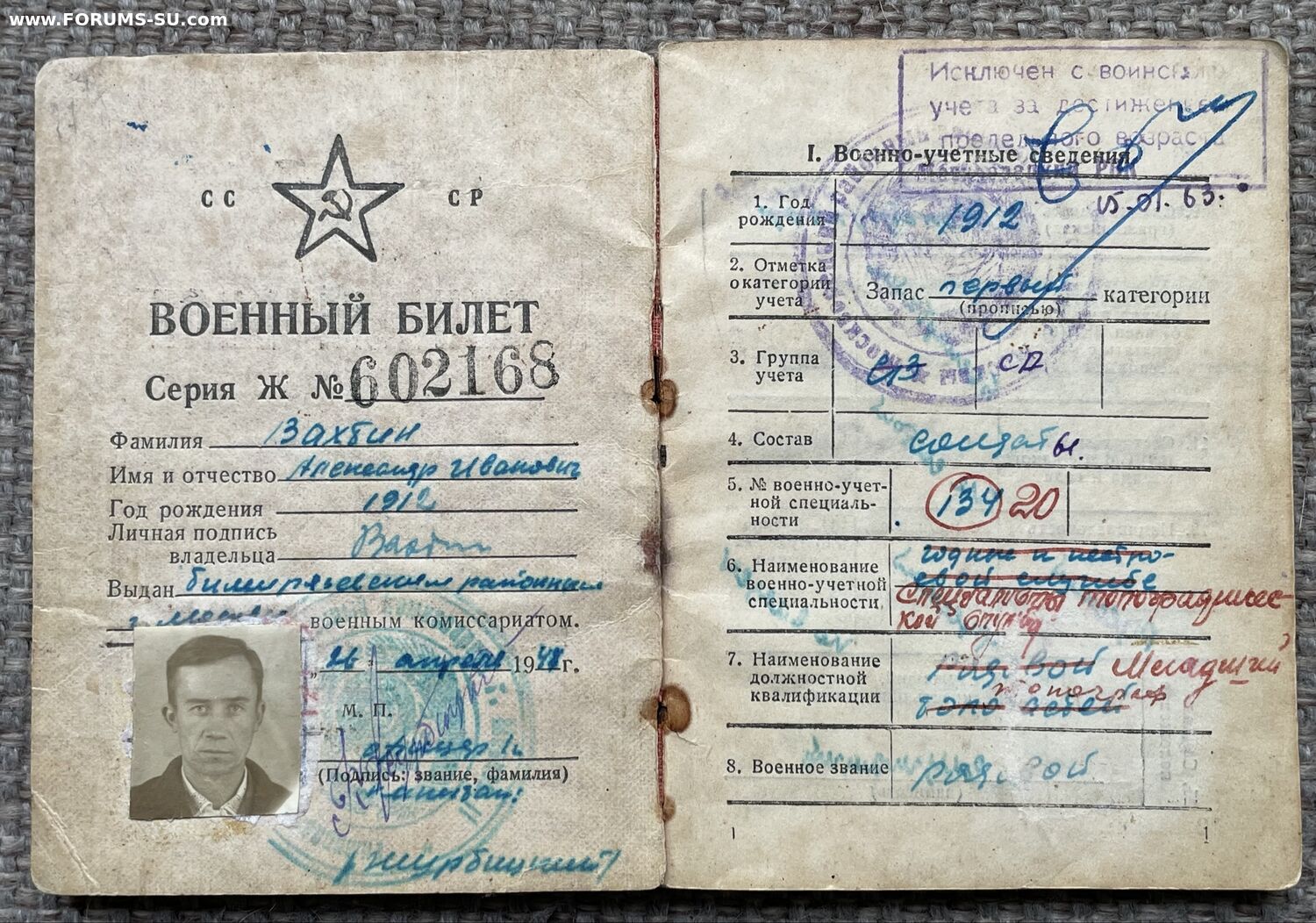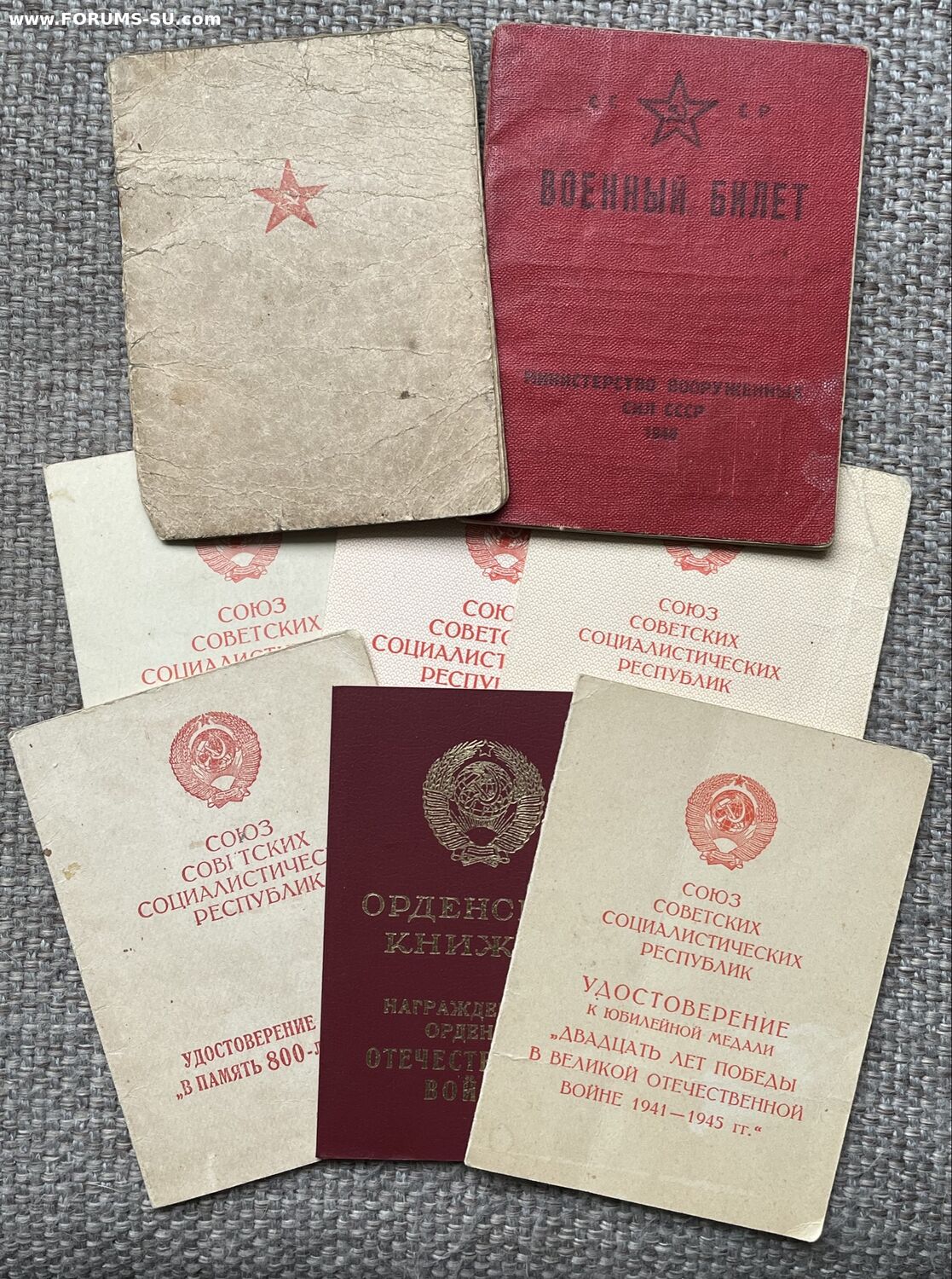 Лот документов на одного владельца: красноармейская книжка, военный билет, удостоверения к медалям.
