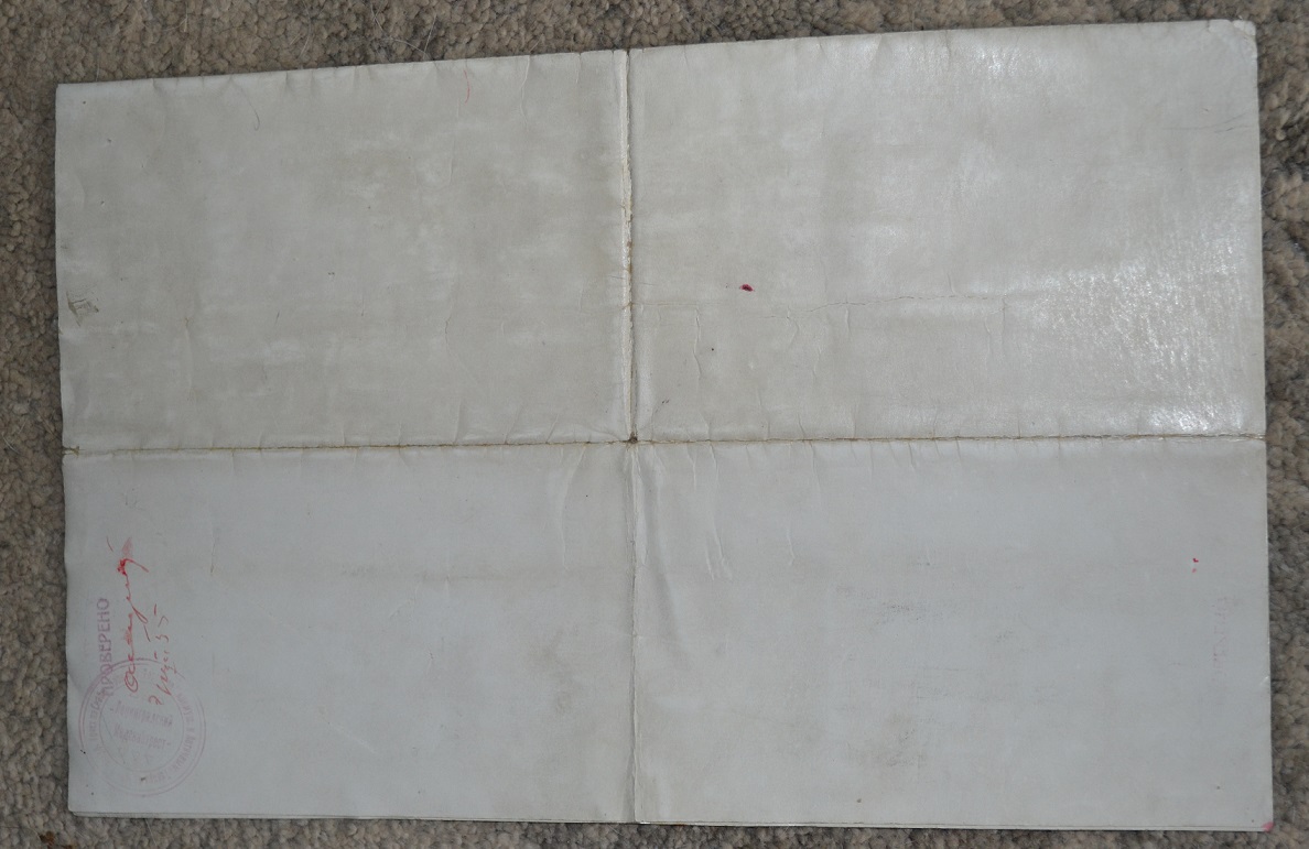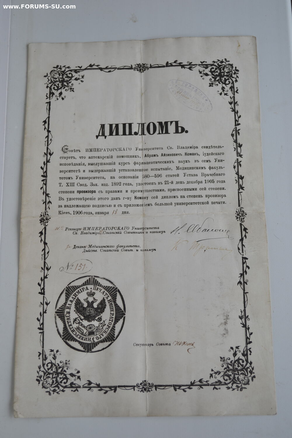 Диплом Имп.университета на степень Провизора к знаку ПРОВИЗОР. Размер документа в развернутом виде 43х35 см