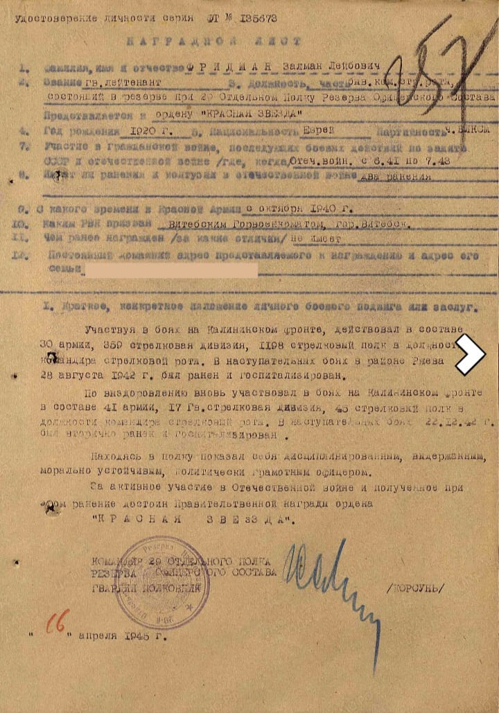 Сохран отличный. УК - нет. Есть определение Фридман Зиновий Лейбович 1920г. Приказ 596/н. В наградном путаница с именем.