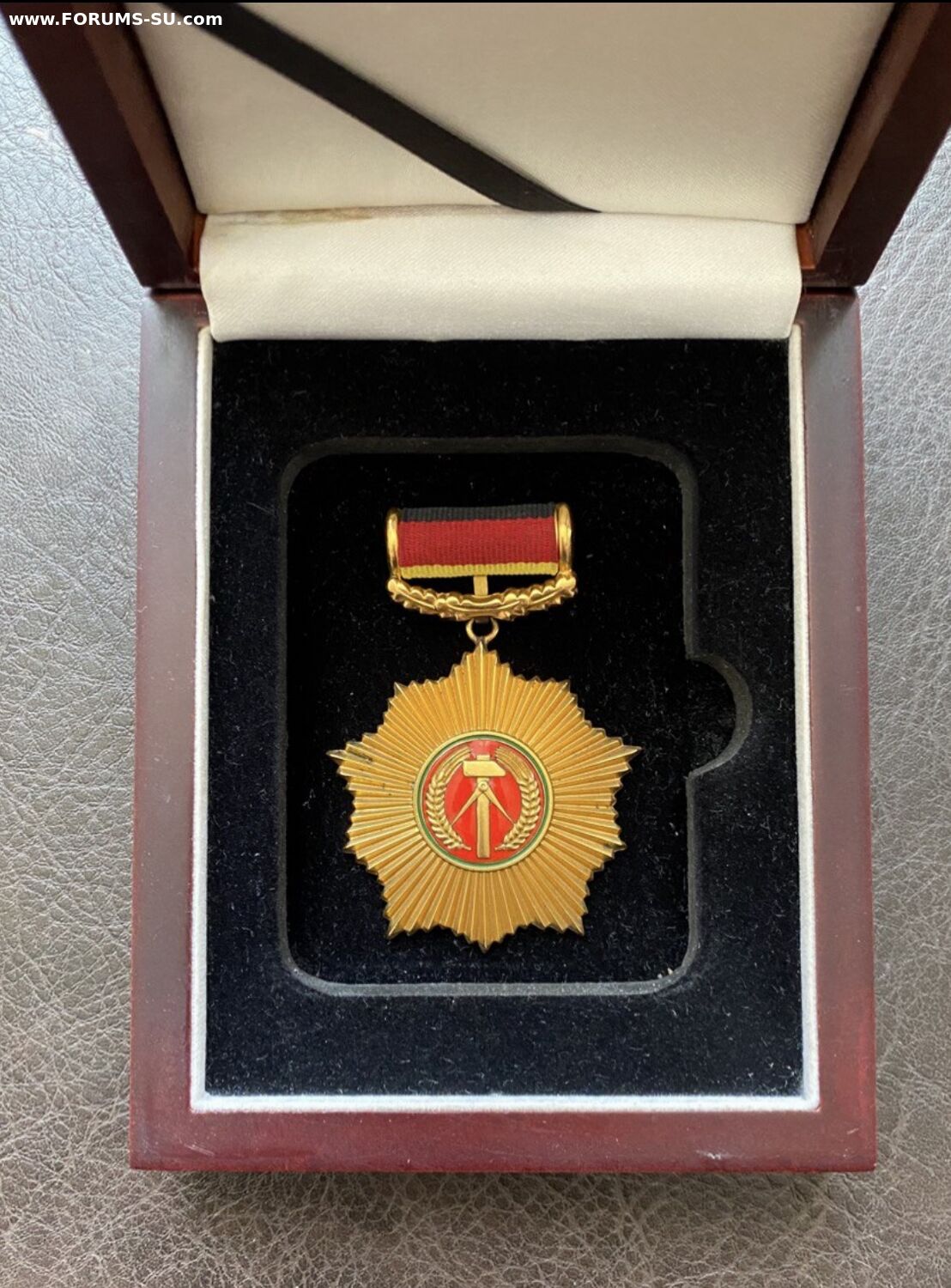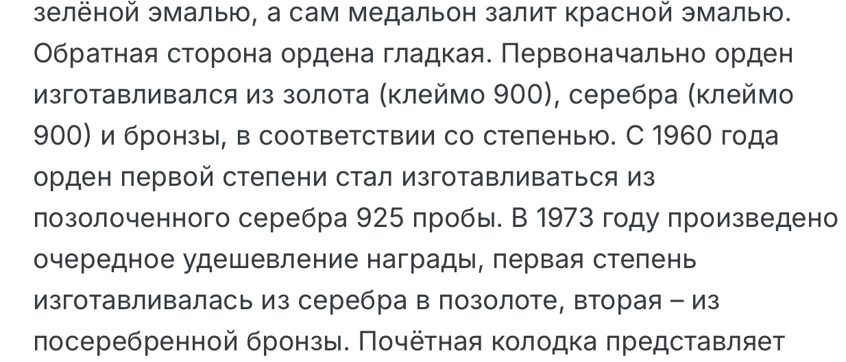 Совсем уважением, но информация которую Вы представили является ошибочной. Этот орден в 1 -ой степени был или из золота (с пробой) или из бунтметала. В серебре первая степень никогда не изготовлялась. В золоте орден выдавался вплоть до прихода Хонекера , т.е. до 1971 г. Известны некоторые награждения полновесным орденом и после этого времени. Вес ордена составляет более 110 гр. с колодкой (мне предлагали весом 114гр).