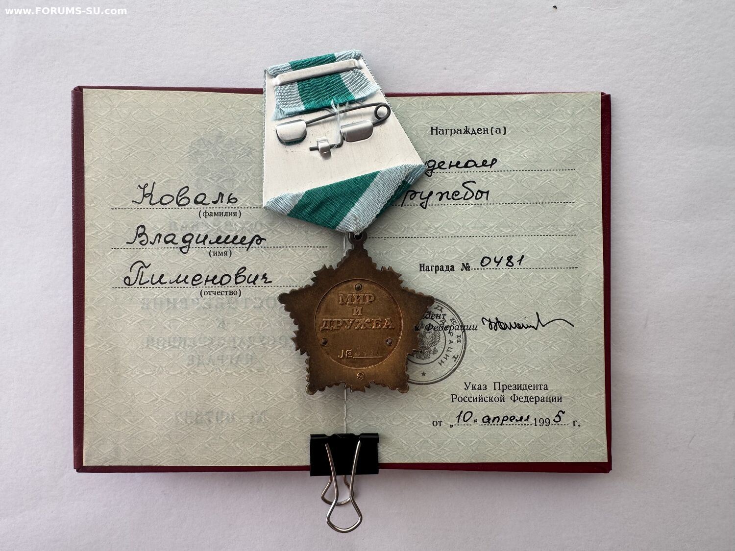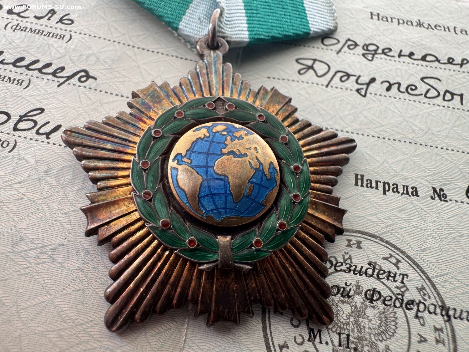 Орден Дружбы РФ № 0481 + документ. Трёхзначный номер. Знак в Люксе, прекрасная патина - без вмешательств.