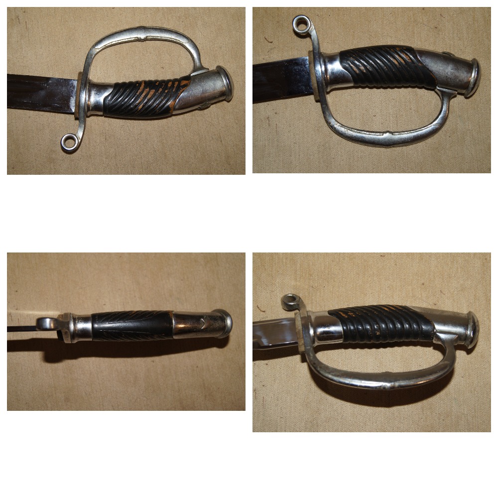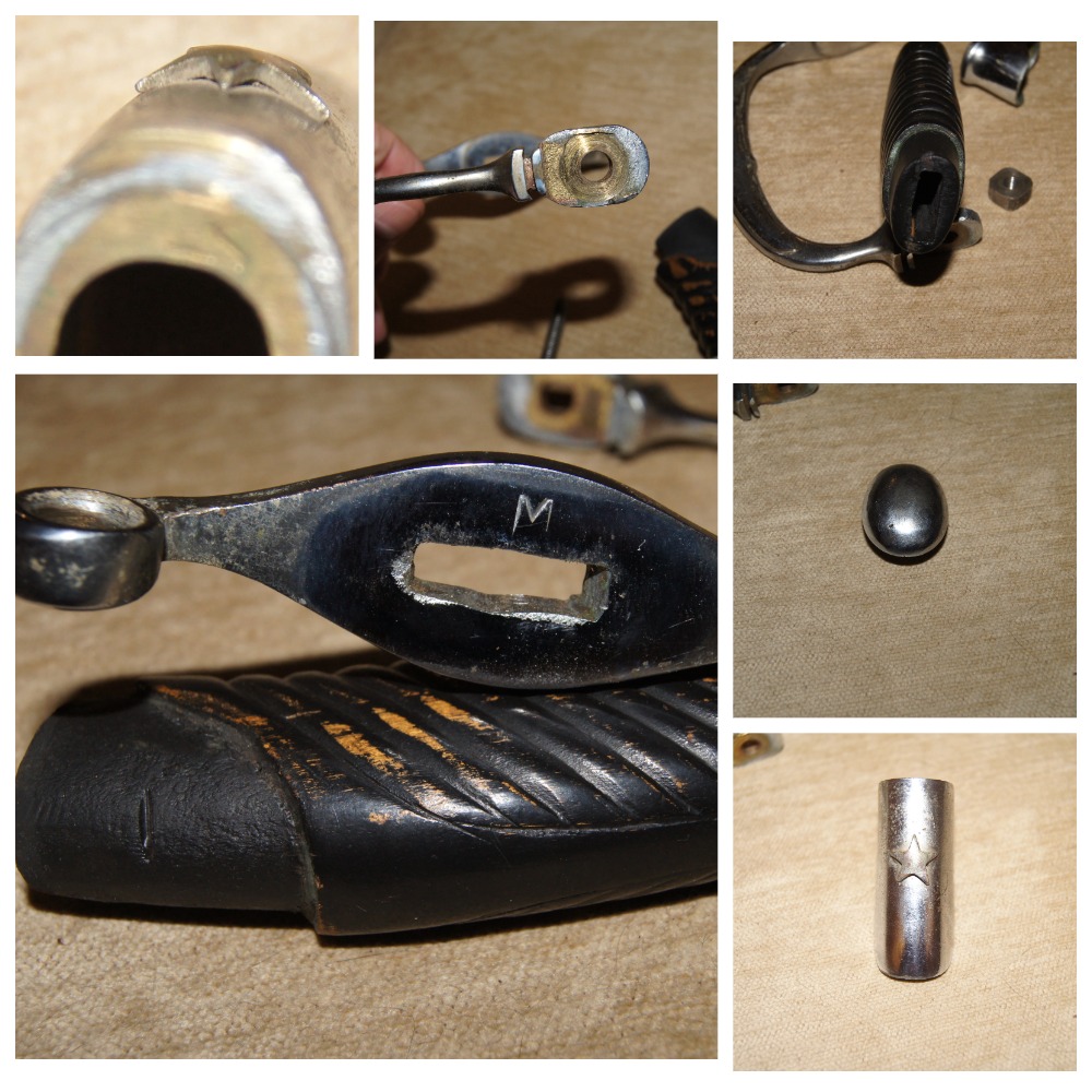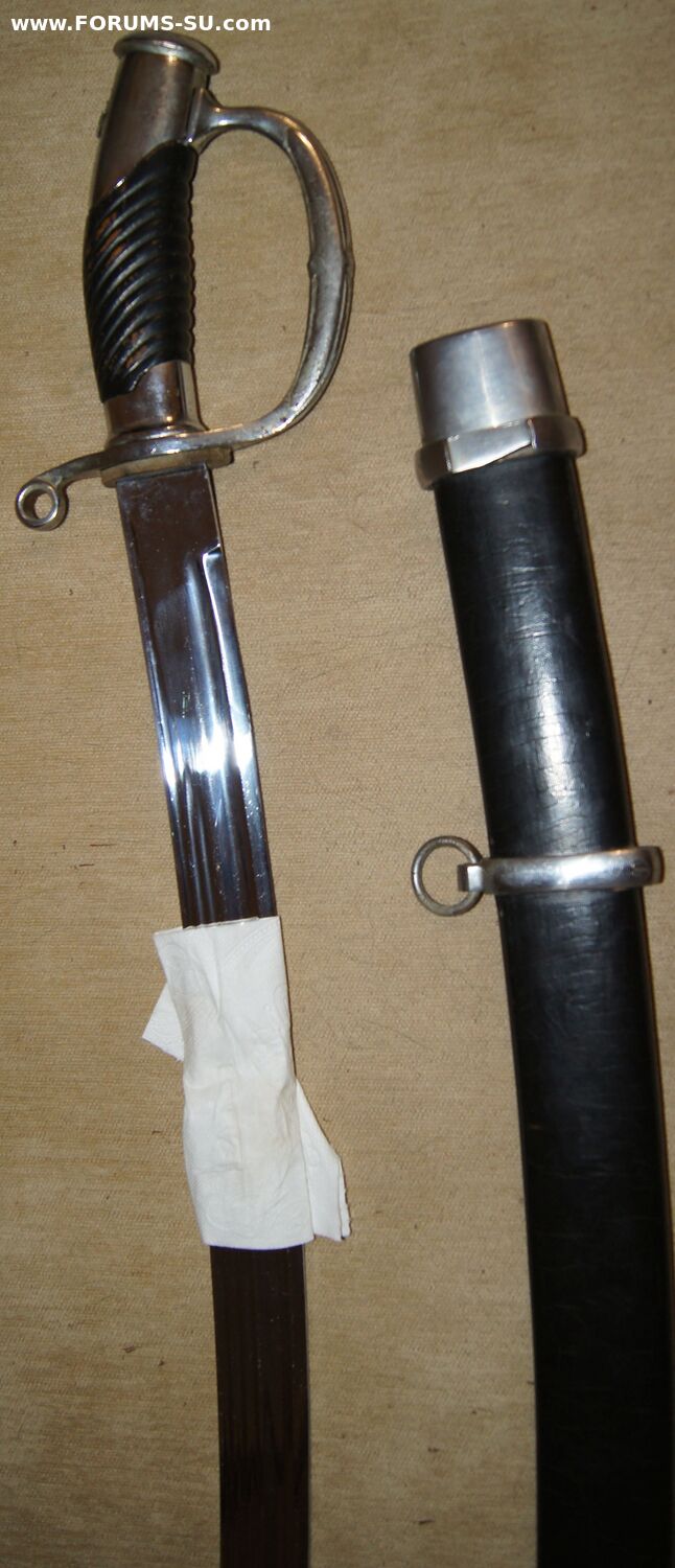 Шашка СССР подзнаменная (НКВДмилиция по Кулинскому), экспериментальная. Уникальный предмет как сам по себе так и по сохранности. Известны в сети несколько подобных образцов, но данный экземпляр имеет существенные отличия. При этом общее состояние, следы бытования, состояние покрытия и множественные мелкие нюансы, подробно представленные на фото, не оставляют сомнений в оригинальности предмета. Ранняя подзнаменка, что уже само по себе большая редкость, в белом металле. Клинок с клеймами Л и М на хвостовике с одной стороны (клеймо Л ставилось на советские шашки в 39 году, М (Мандич) 38-42 года), с другой стороны хвостовика стоит клеймо М в несколько другом исполнении (оба варианта есть в темах по советстким шашкам на профильных форумах). Все элементы эфеса проклеймены М. Звезда накладная, крепится винтом, а не усами, как на ранних подзнаменках в желтом металле (полагаю это особенность подзнаменок в белом металле, известные мне экземпляры исполнены именно так). СиМ стерт, возможно не наносился, в данном случае не разборчиво. При этом отсутствует герб на устье. Фурнитура ножен без клейм, расположена под сабельное ношение, что соответствует потертостям на черене, износом покрытия фурнитуры ножен и дефектом на дне нижнего стакана: носилась именно таким образом. Покрытие ножен весьма специфическое, соответствует известным подобным образцам. Клинок идеальном состоянии, геометрия не нарушена, раздоловка в области пяты соответствует ранним подзнаменкам и генеральским образцам.
