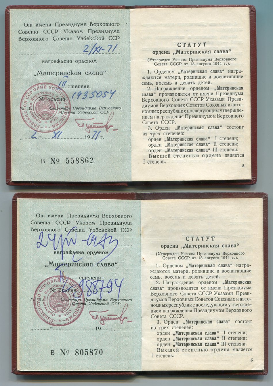 Знаки в отличном состоянии, неношеные. Единственный дефект микрочешуйка на звезде у МС 2. Большая грамота в папке в наличии. Документы на медали материнства отсутствуют. Доп фото по запросу. МПЦ 70 000 р. Ставка не перебитая сутки после прохождения МПЦ побеждает. Доставка 450 р.