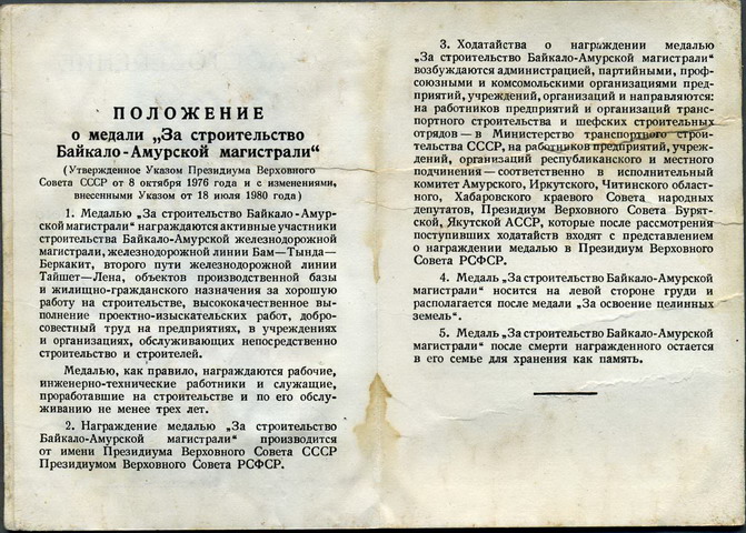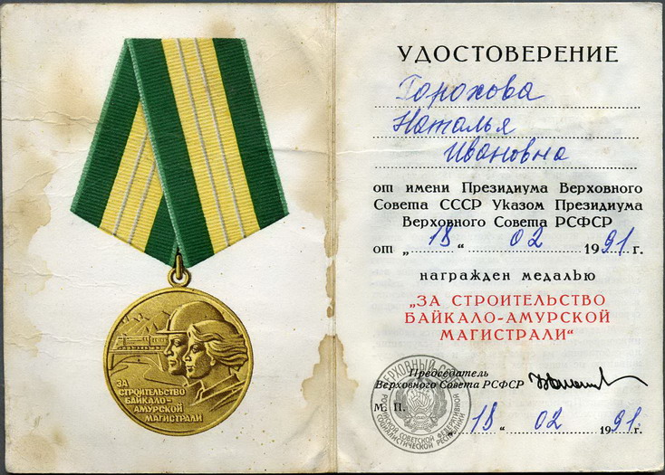 Медали Серп и Молот, За Трудовую Доблесть, За Трудовое Отличие, За Доблестный Труд в Великой Отечественной Войне,За Восстановление Предприятий Чёрной Металлургии Юга, За Восстановление Угольных Шахт Донбасса, За Освоение Целинных Земель, За Строительство БАМ, За Преобразование Нечерноземья РСФСР, За Освоение Недр и Развитие Нефтегазового Комплекса Западной Сибири, Ветеран Труда