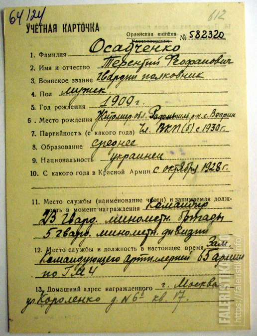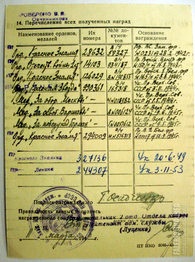Красного Знамени, Суворова, Кутузова, Богдана Хмельницкого, Александра Невского, Ушакова, Нахимова, Отечественной Войны, Красной Звезды, Славы, За Службу Родине в ВС СССР