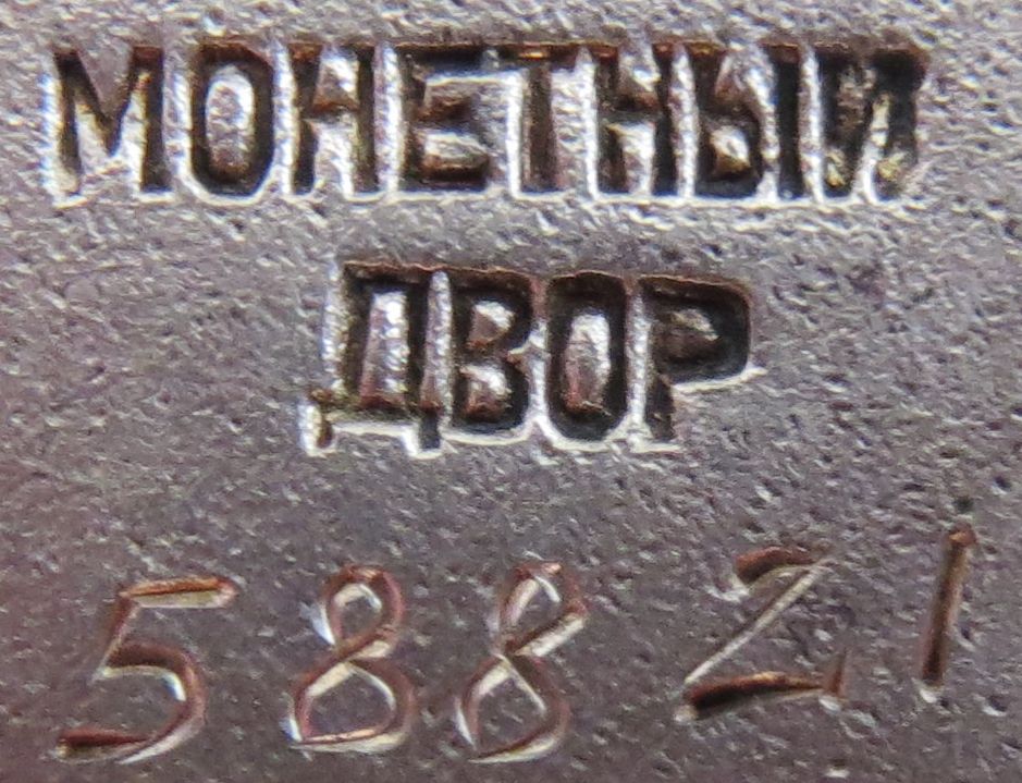 Тип 3, Вариант 3. Клеймо расположено несколько ниже центра реверса (ранние экземпляры), либо в центре реверса. Оба слова клейма прямые, без изгибов. Длина слова "МОНЕТНЫЙ" - 8,5 мм (среднее клеймо). Минимальный известный номер – 58821, максимальный – 98765. http://mondvor.narod.ru/OZnPoch3.htm