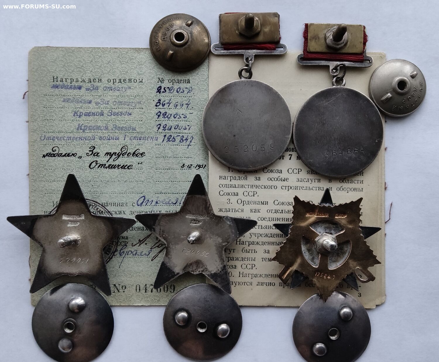 РАЗВЕДЧИК ОВ-1- 125847; КЗ-2ШТ. 720051,720055, ЗА ОТВАГУ КВАДРО 2ШТ. 252059, 364664; ТРУДОВОЕ ОТЛИЧИЕ ЗА ЯДЕРНЫЕ ИСПЫТАНИЯ