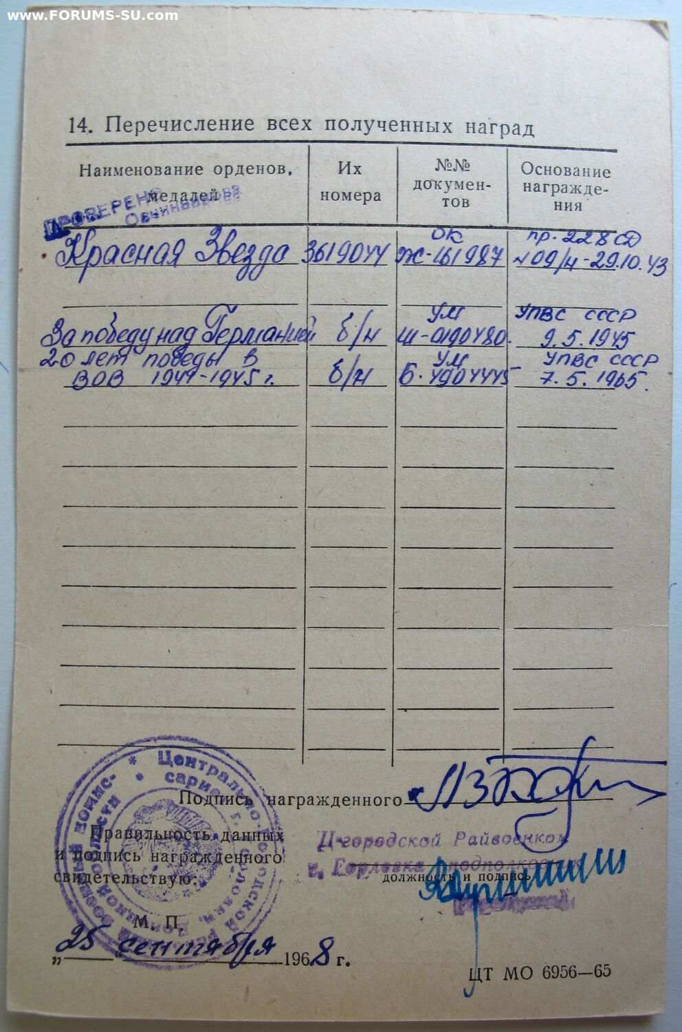 Красного Знамени, Суворова, Кутузова, Богдана Хмельницкого, Александра Невского, Ушакова, Нахимова, Отечественной Войны, Красной Звезды, Славы, За Службу Родине в ВС СССР