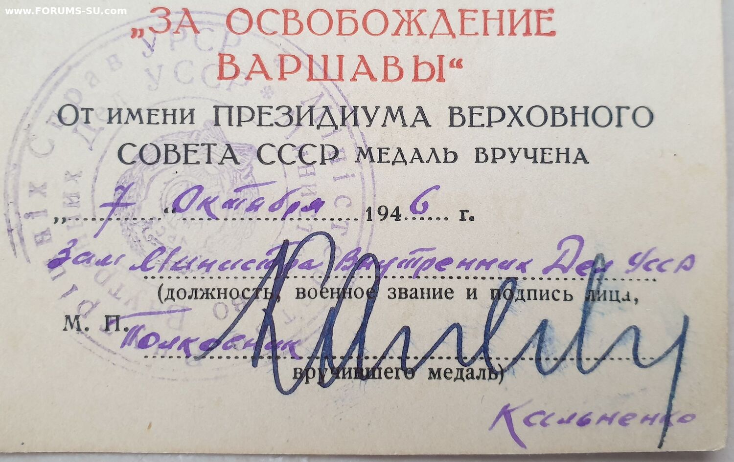 Варшава подпись полковник Кальненко Тимофей Семенович , заместитель министра МВД УССР