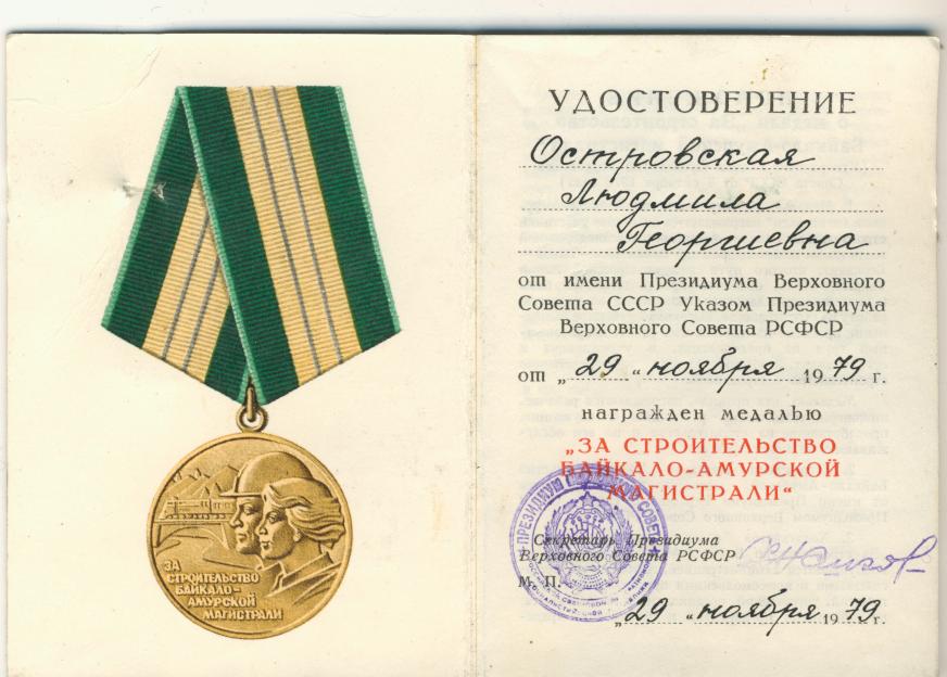 Медали Серп и Молот, За Трудовую Доблесть, За Трудовое Отличие, За Доблестный Труд в Великой Отечественной Войне,За Восстановление Предприятий Чёрной Металлургии Юга, За Восстановление Угольных Шахт Донбасса, За Освоение Целинных Земель, За Строительство БАМ, За Преобразование Нечерноземья РСФСР, За Освоение Недр и Развитие Нефтегазового Комплекса Западной Сибири, Ветеран Труда
