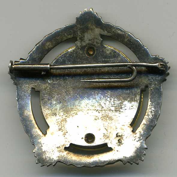 Реверс: медальон крепится к основе при помощи двух заклёпок на 12 и 6 час. Порядкового номера нет. На пяти часах нанесено пятиугольное клеймо «IKOM» и ювелирное клеймо.
