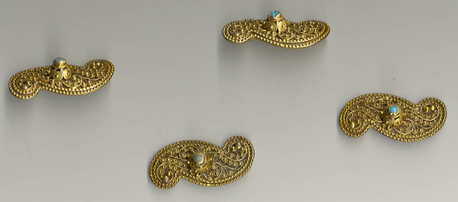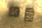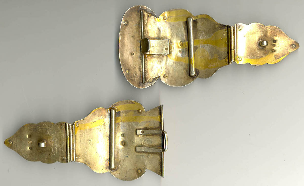 Пряжка состоит из двух частей + четыре накладки на ремень. Техника: скань. Серебро 84 пробы. Камни. Клеймо мастера КА (вариантов два - либо это неизвестный мастер с Кавказа, творивший в начале века в Царской России либо это Карл Антритер. Вещи обоих мастеров ныне представлены в ГИМе). Размеры 24х10см.
