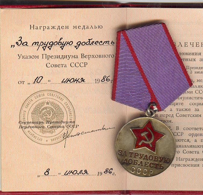 Медали Серп и Молот, За Трудовую Доблесть, За Трудовое Отличие, За Доблестный Труд в Великой Отечественной Войне,За Восстановление Предприятий Чёрной Металлургии Юга, За Восстановление Угольных Шахт Донбасса, За Освоение Целинных Земель, За Строительство БАМ, За Преобразование Нечерноземья РСФСР, За Освоение Недр и Развитие Нефтегазового Комплекса Западной Сибири, Ветеран Труда