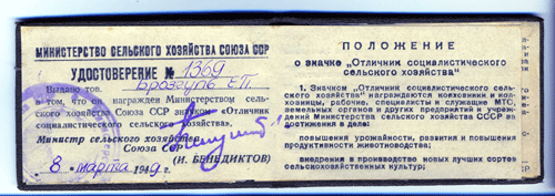Знак в люксе,в родной коробке с очень интересным доком.Обратите внимание,дама была награждена вчесть 8 марта 1949 года знаком уже не существующего министерства.Обратите внимание на удостоверение представленное в каталоге "Ведомственные знаки отличников" к знаку Отличник МСХ СССР выданное тем же 1949 годом.